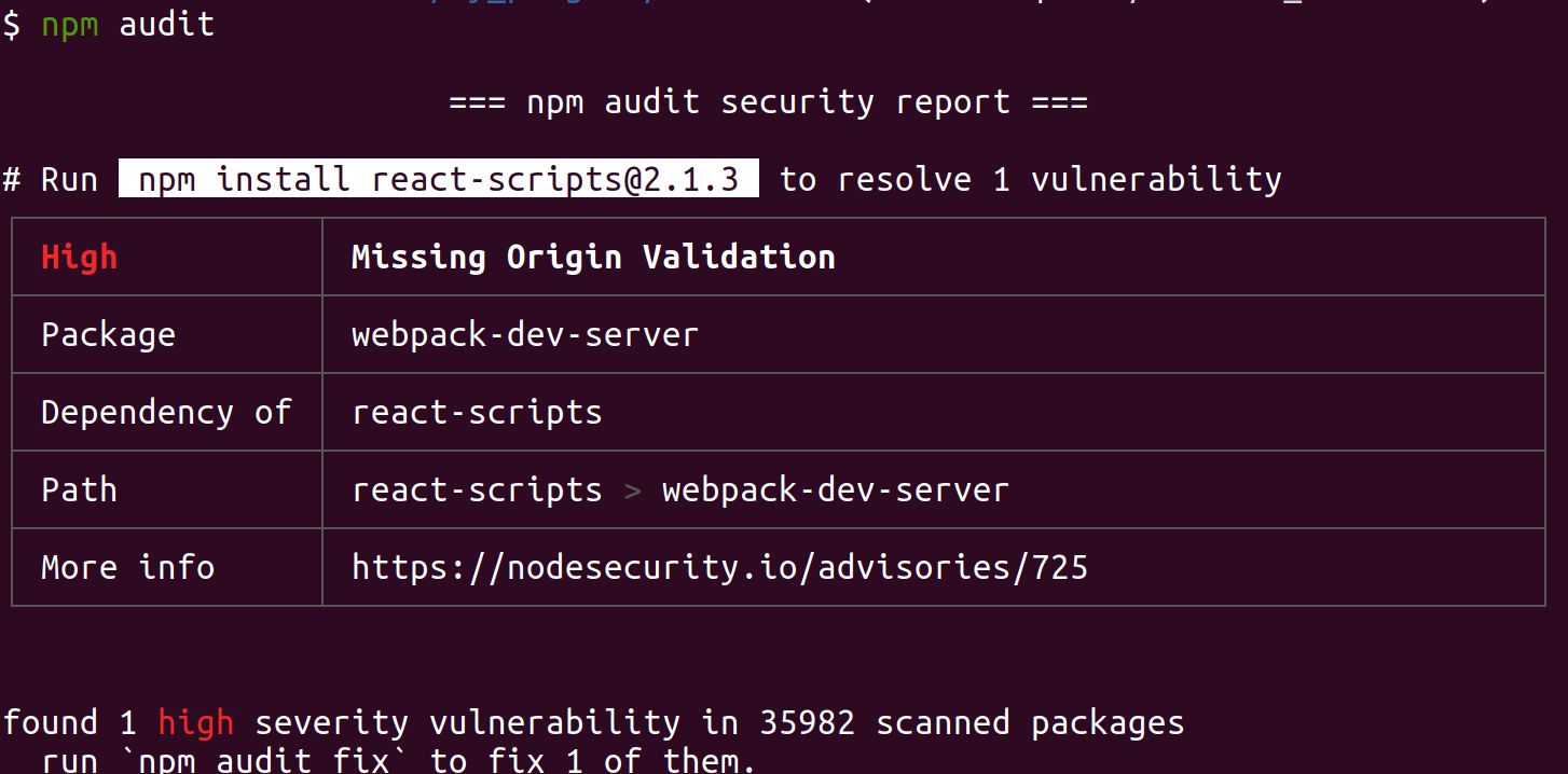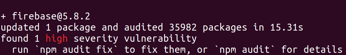$ npm audit fixを使うことで治せるとあるが、詳細を確認するため$ npm auditを打つ。