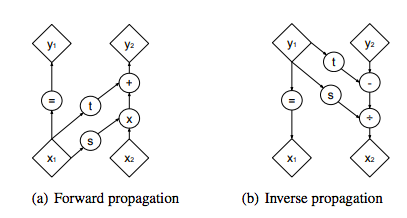 確率モデルを定義する観点で、カップリングレイヤのその他の面白い性質として、その可逆性がある。実際、逆方向の計算が順方向の伝播より複雑になることはなく(図2(b)参照)、
