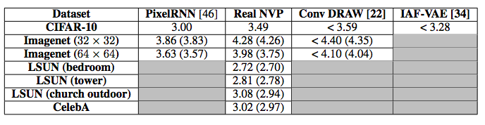 bits per dimensionの値を表1に示した。ベースラインのPixel RNN [46]より優れているとは言えないが、他の生成モデルとは互角である。パラメータ数の増加につれて性能が上がっていることがわかるため、より大きいモデルでは更に性能が上がると予想される。CelebAとLSUNでは、バリデーションセットのbits per dimensionは訓練中いたるところで減少しており、少し過学習があるとみられる。bits per dimension