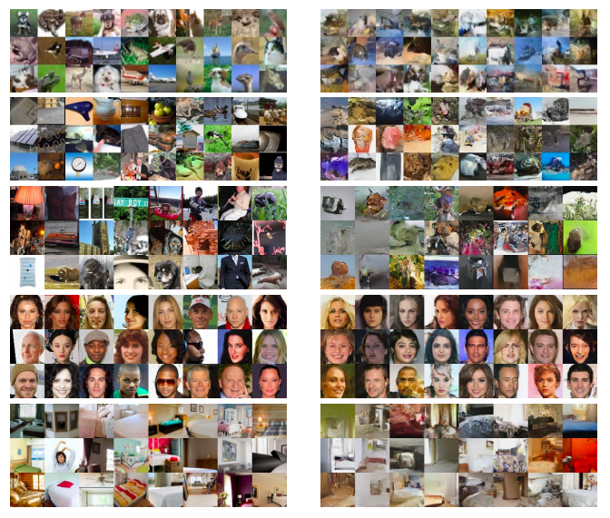 図5: 左の列はデータセットのサンプル。右の列はそのデータセットで訓練されたモデルのからのサンプル。この図にあるデータセットは次の順。CIFAR-10, Imagenet (32 × 32), Imagenet (64 × 64), CelebA, LSUN (bedroom)また、潜在変数のなめらかな一貫した意味づけについても示す。本論文では潜在空間で、4つのバリデーションサンプル$z_{(1)},z_{(2)},z_{(3)},z_{(4)}$に関して多様体を定義し、2つのパラメータ$\phi$および$\phi'$について次のようにパラメータ表示した。
