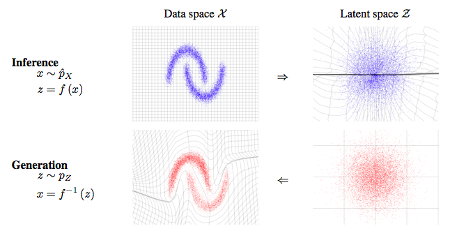 観測されたデータ変数$x \in X$、潜在変数$z \in Z$上のシンプルな事前確率分布$p_Z$、全単射な$f:X \rightarrow Z$($g=f^{-1}$とする)があり、変数変換の式はXにおけるモデル分布を次のように定義する。