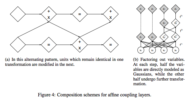 図3:アフィンカップリングレイヤのマスキング手法。左は空間的チェッカーボードパターンマスク。右はチャネルごとマスク。絞り(squeezing)操作は4x4x1テンソル(左)を2x2x4テンソル(右)に縮める。絞り操作の前にチェッカーボードパターンはカップリングレイヤのために使用され、チャネルごとパターンはその後使用される。黒が1,白が。squeezingってなんだ?処理のどこかにsqueezeが入っていて、マスクはその前後で2種類とも利用される(マスク$\neq$squeeze)ということかな3.5. カップリングレイヤを結合する
