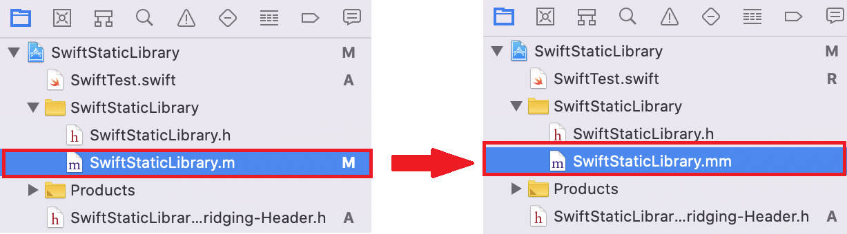※Swiftのヘッダーファイルを生成させる- 初期で作成されている、「Objective-C」のファイルの拡張子を、「m」を、「mm」にする