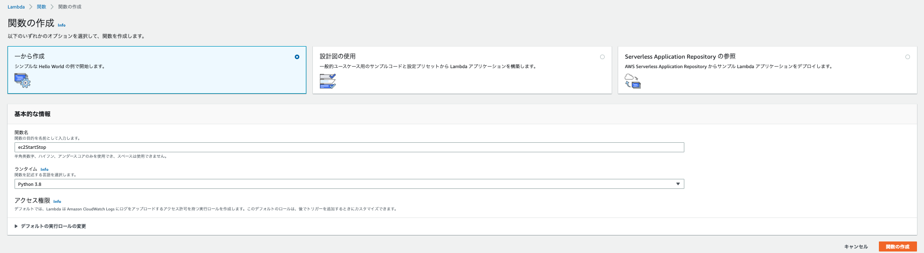 Lineから「起動」「停止」というメッセージを受け取って、対応するアクションを行う仕様とします。Lambda -> 関数の作成 -> 一から作成 -> ランタイムにPython3.8を選択 -> 関数の作成