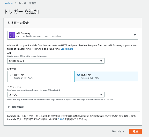 作成したLambdaのデザイナー上から、トリガーを追加を選択し、API Gatewayをトリガーとして追加します。
