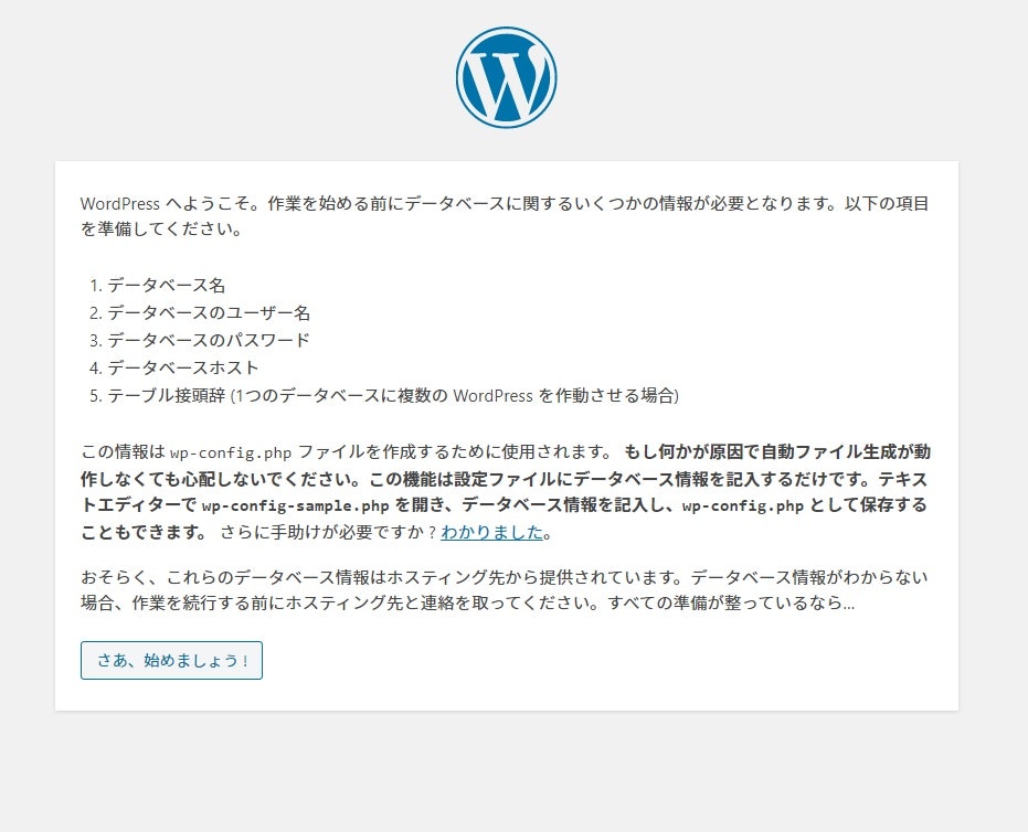 手順にあった「chmod」で権限を変更していない場合、WordPressがDBに関する内容を設定ファイルを書き込む事が出来ないため、エラーとなりこの画面にたどり着けません。