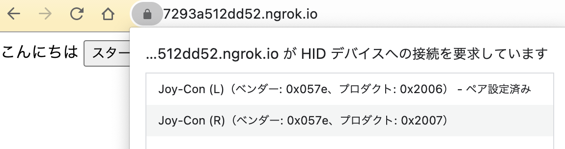 vendorIdやproductIdが↓のような値なので指定しましょう。// Filter on devices with the Nintendo Switch Joy-Con USB Vendor/Product IDs. const filters = [ { vendorId: 0x057e, // Nintendo Co., Ltd productId: 0x2006 // Joy-Con Left }, { vendorId: 0x057e, // Nintendo Co., Ltd productId: 0x2007 // Joy-Con Right } ]; const main = async () => { // Prompt user to select a Joy-Con device. const [device] = await navigator.hid.requestDevice({ filters }); }; if ("hid" in navigator) { // The WebHID API is supported. console.log(`HIDが使えるよ`); const btn = document.querySelector(`button`); btn.addEventListener('click', main); }else{ console.log(`HIDが使えません`); }Webサイトにアクセスし、スタートボタンを押すと接続済みのJoy-ConがHIDとして認識されます。