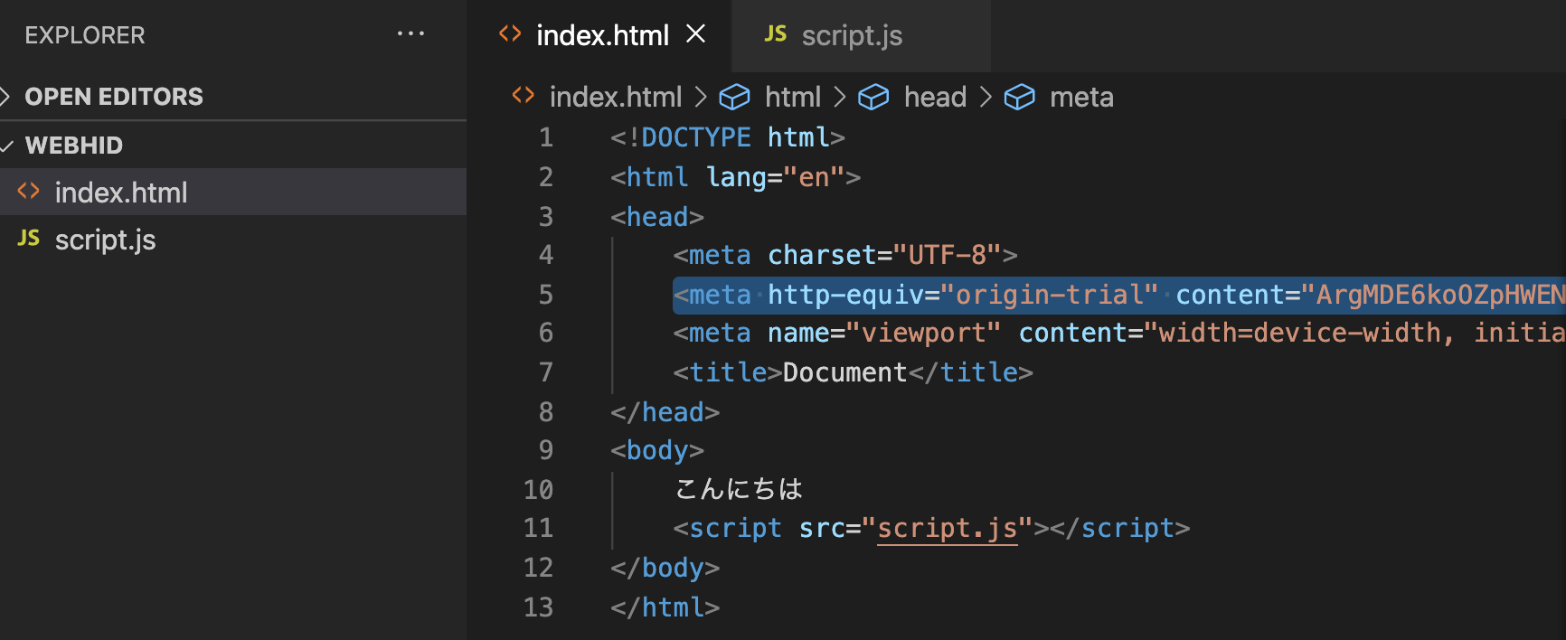 利用するページのHTMLファイルのmetaタグに以下のような指定をし、発行されたトークンを指定することでWebHID APIが利用出来ます。