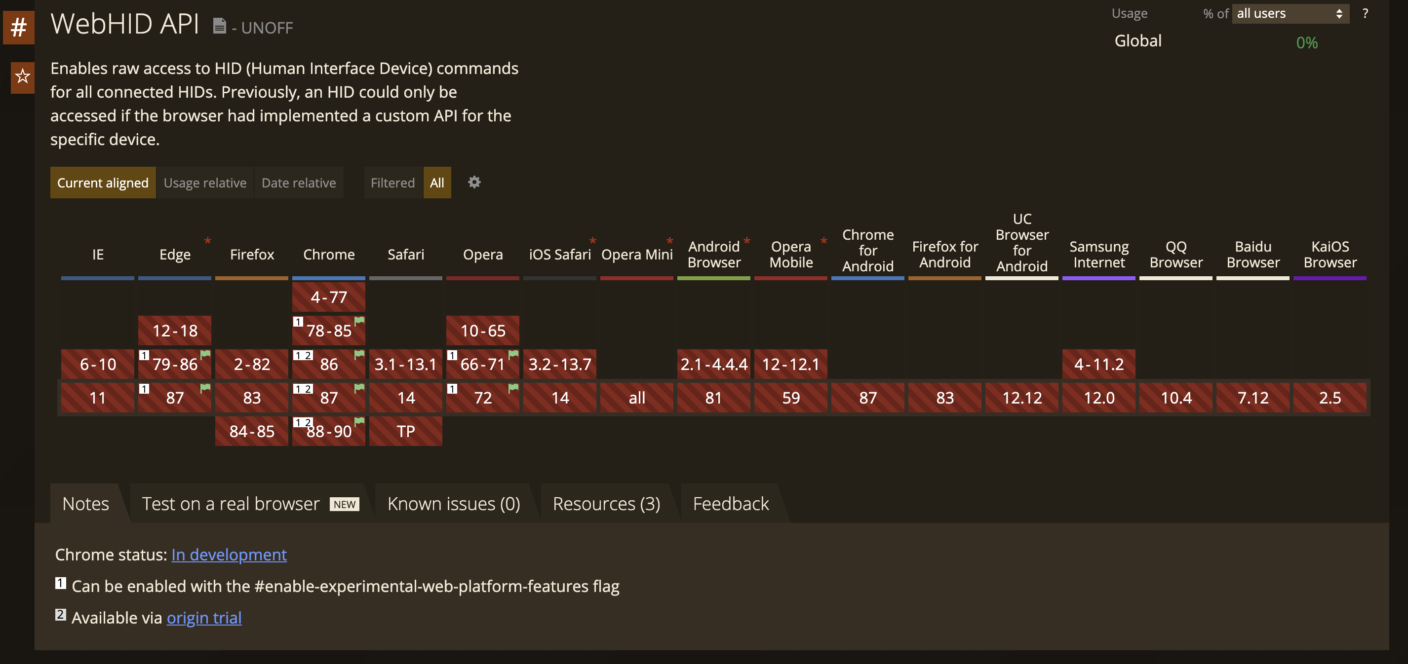 https://caniuse.com/?search=webhid見てみると全然対応してないですね、最新版のChromeでもアップデートしただけでは使えず、オリジントライアルという利用するオリジン(利用するサイト的な)の登録作業をし、利用するユーザーのChromeのフラグ設定を変えてやっと利用出来ます。
