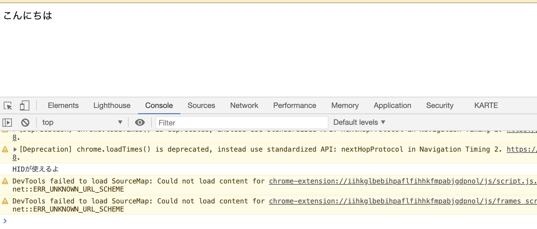 navigator.hidが利用出来ます。if ("hid" in navigator) { // The WebHID API is supported. console.log(`HIDが使えるよ`); } else { console.log(`HIDが使えません`); }コンソールに