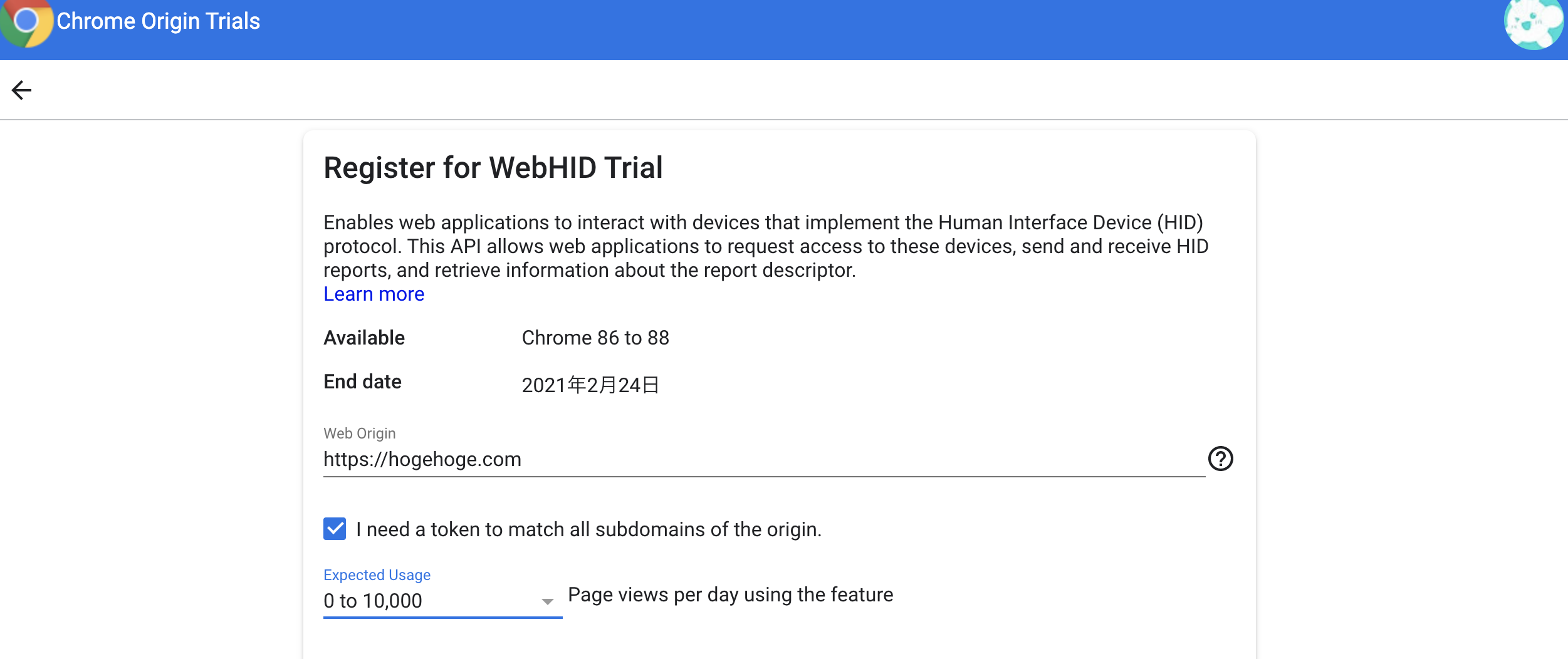 WebHID APIは、現状オリジントライアルというステータスで、利用するオリジンをGoogleに申請する必要があります。