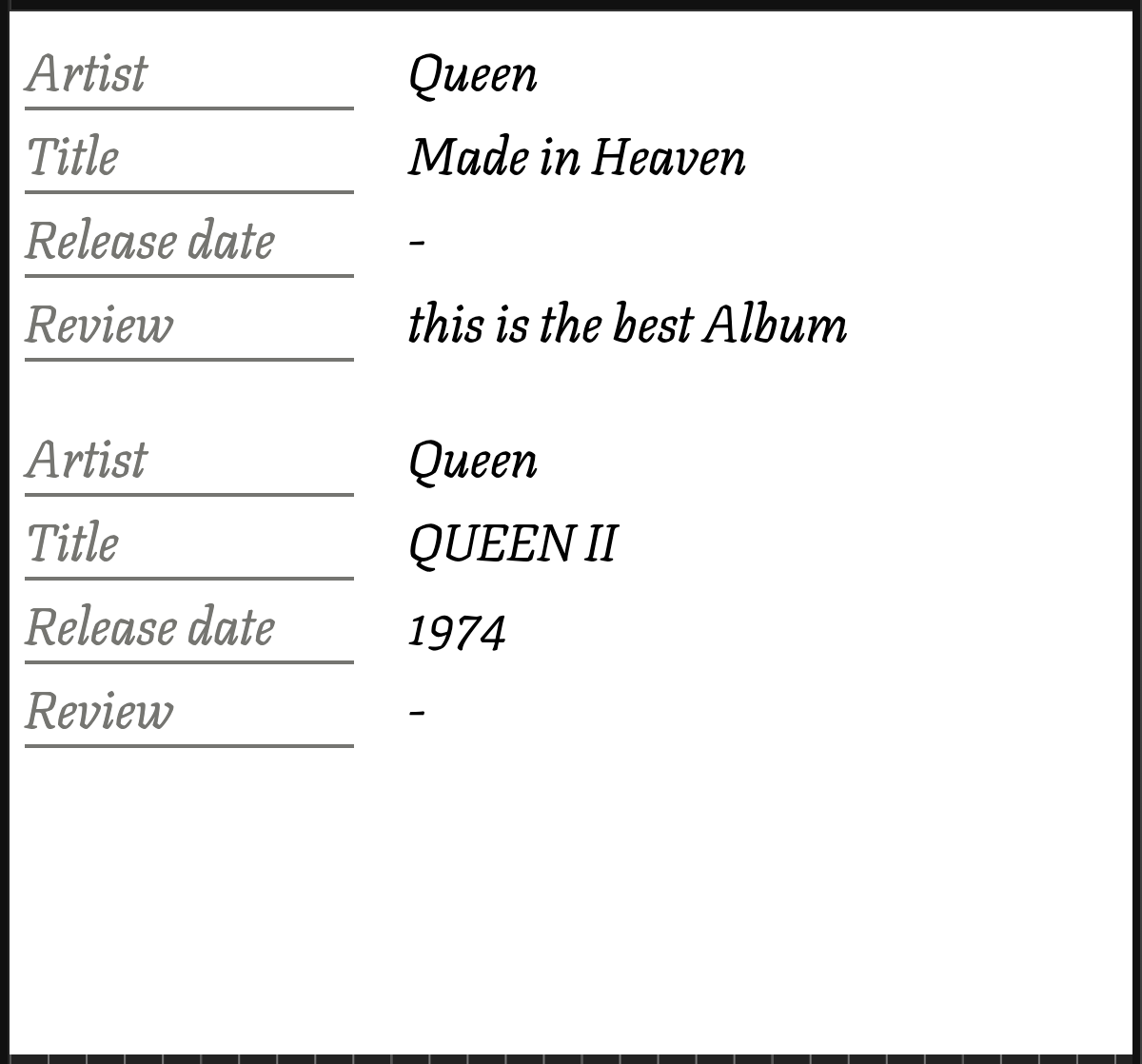 import React, { useState } from 'react'; import { StyleSheet, View, FlatList } from 'react-native'; import GoalItem from './components/GoalItem'; export default function App() { const [courseGoals, setCourseGoals] = useState([]); //courseGoalsには以下のような配列が入っている。 Array [ Object { "id": "0.1283113872926156", "value": "Aaa", }, Object { "id": "0.1515628656002196", "value": "Aaa", }, ] // return ( <View style={styles.screen} > <FlatList keyExtractor={(item, index) => item.id } //デフォルト値なので省略可 data={courseGoals} // ここに繰り返したい配列をいれる。 renderItem={itemData => <GoalItem id={itemData.item.id} title={itemData.item.value} />} // viewの部分 引数itemDataの.itemプロパティに配列の要素が一つづつ繰り返し入ってくるような感じ /> </View> ); }GoalItem.js