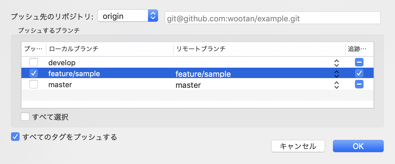 ブランチを削除を選択した状態でOKをクリックするとローカルとリモートのブランチが自動的に削除されます。