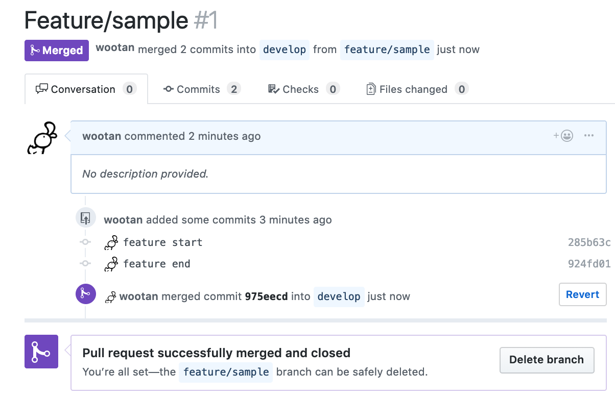 featureの変更内容はすべてdevelopに取り込まれているので、履歴はこのようになります。