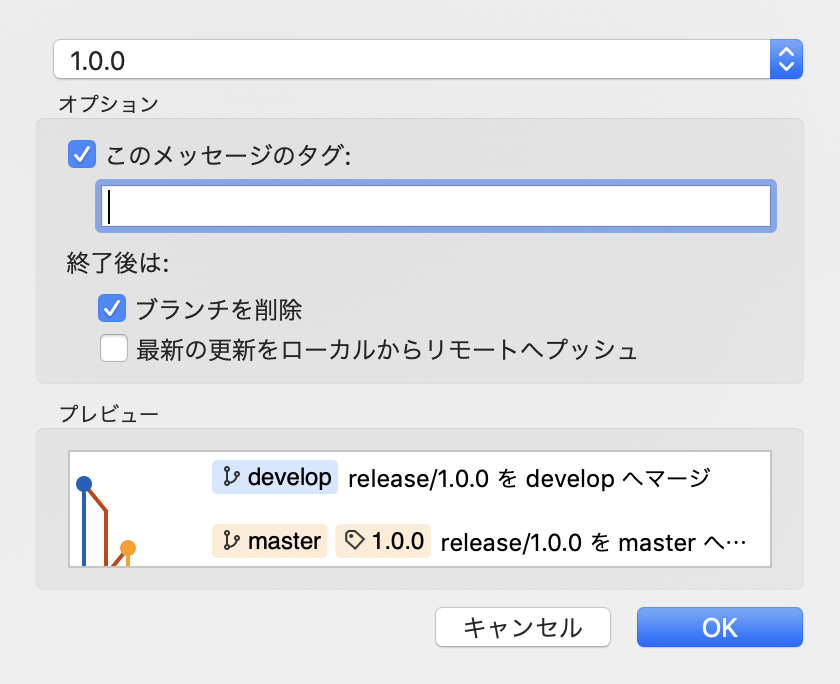 タグのメッセージを入力とブランチのプレビューの確認します。