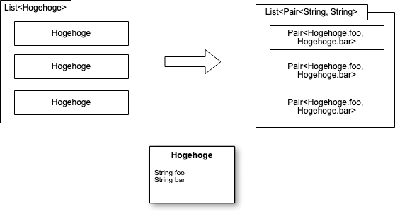 List<Hogehoge> list; List<Pair<String, String>> pList = list .stream() .map(hoge -> Pair.of(hoge.getFoo(), hoge.getBar())) .collect(Collectors.toList());\(^o^)/
