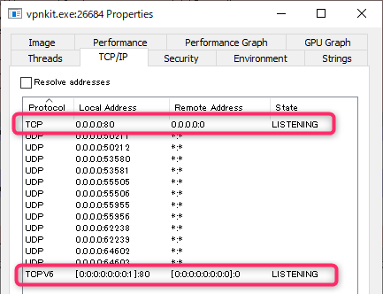 vpnkit.exeは、自身が Port Forwarding するその Port で Listen し始める。