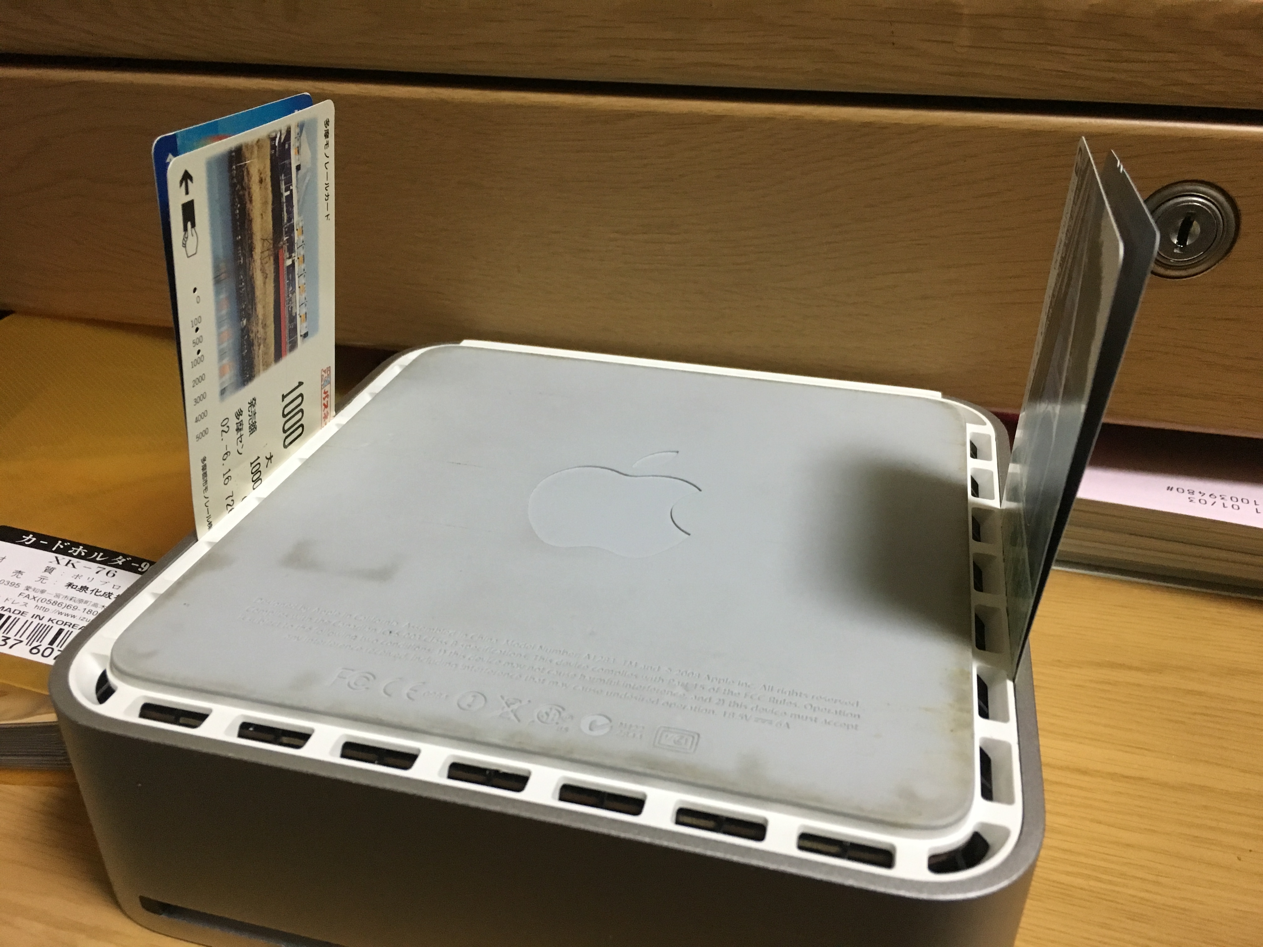 さて、このMacビス止めではないので開けるのが大変。隙間に写真のようにパスネットやテレフォンカードを入れ、スクレーパーでこじ開けます。(図書カードやQUOカードだと柔らかくてうまくいかない。)