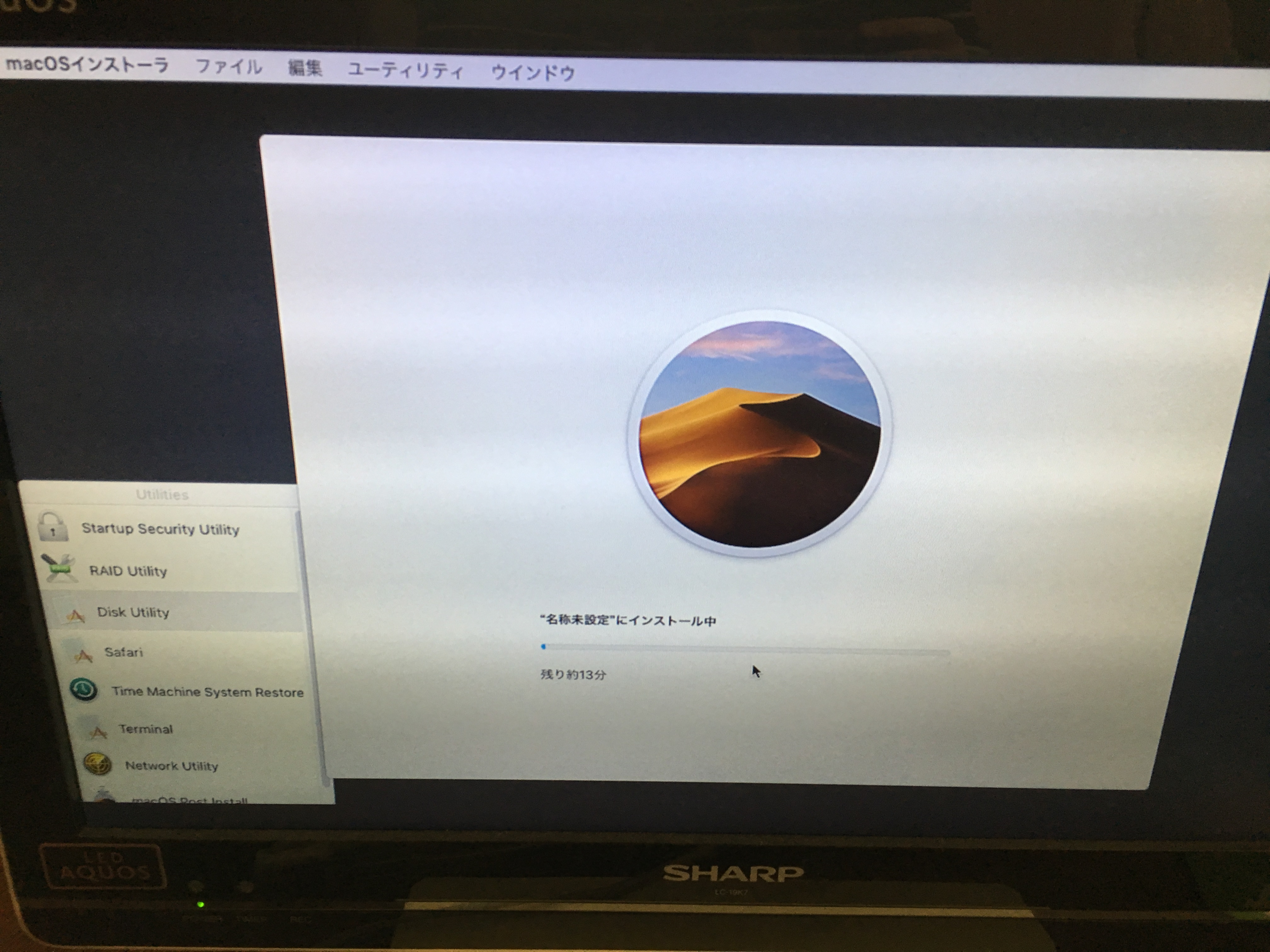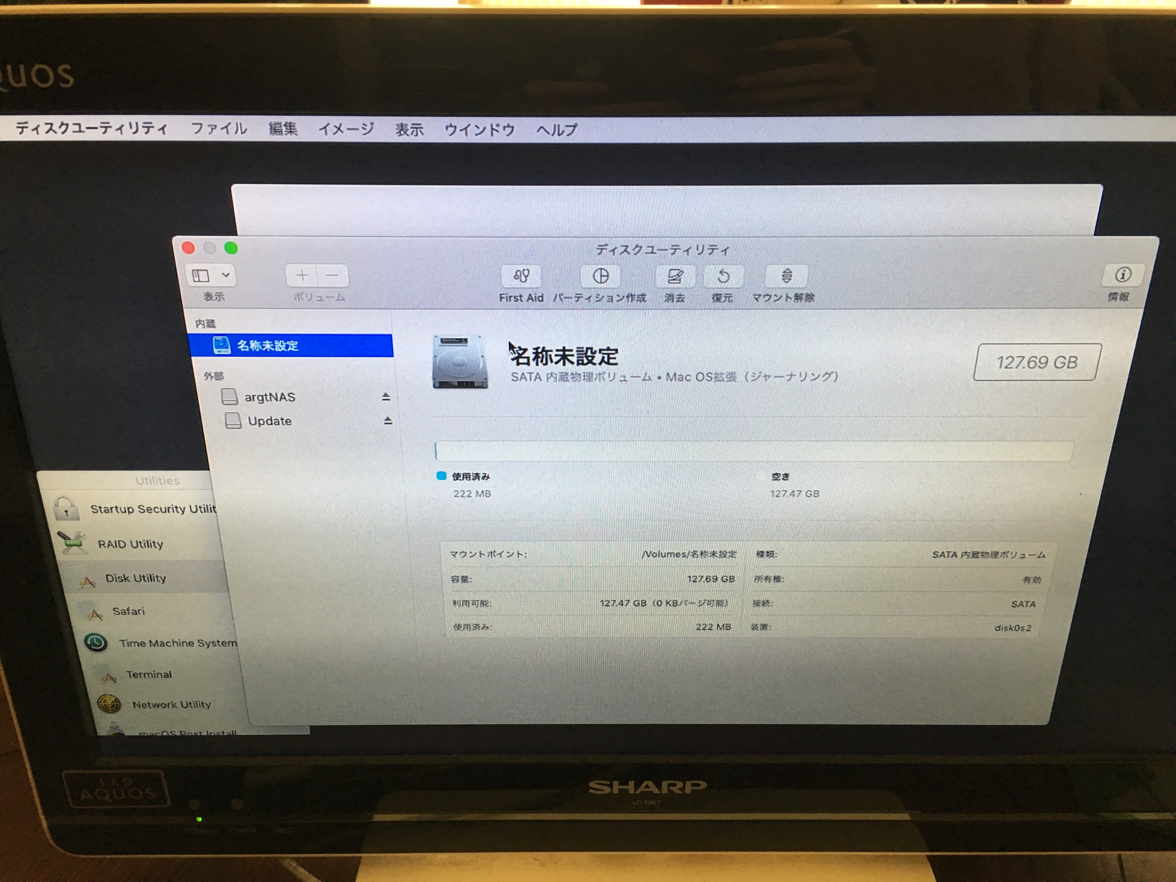 名称未設定になっているのが嫌だったので、ディスクユーティリティからMacintosh HDに変更しました。先程と同様の手順でもう一度パッチを当て、再起動すると無事起動しました。