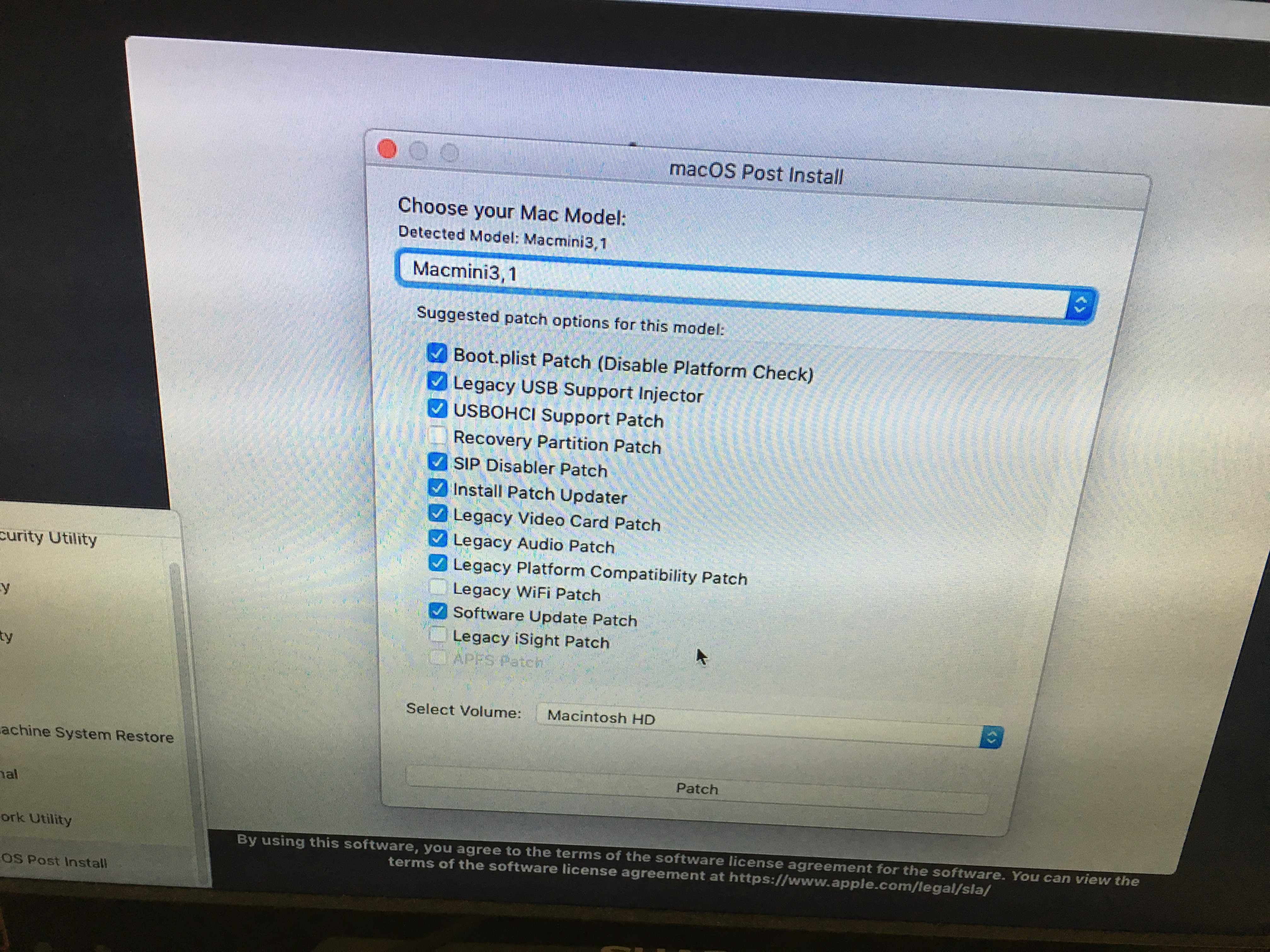 システムレポートから調べられるモデル番号を選びます。ここでは、Macmini3.1。OSを入れたSSDを選びPatchをクリック。パッチを当て終わり再起動すると、なぜかカーネルパニックを吐きました。再度外付けHDDから起動し