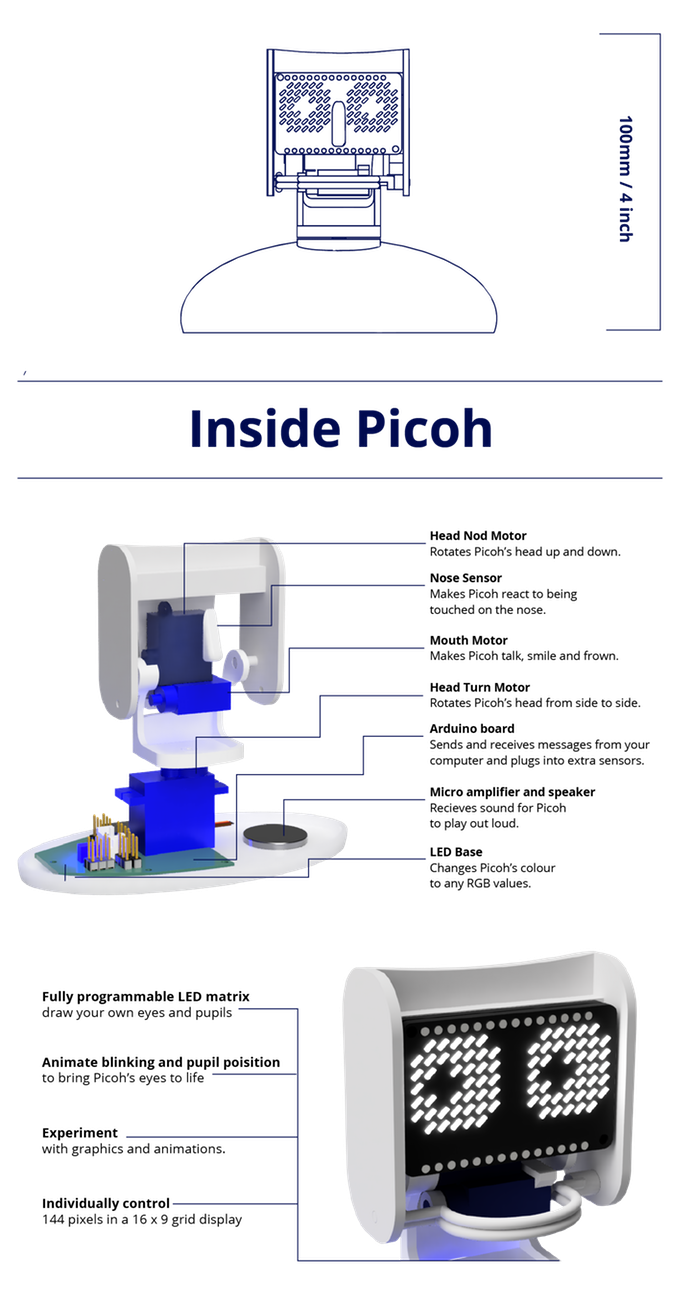 搭載機能(センサー) 説明 ヘッドノッドモーター ピコの頭を上下に回転させる 鼻センサー 鼻に触れてピコーを反応させる 口のモーター ピコトーク、笑顔としかめ面 ヘッドターンモーター ピコの頭を左右に回転させる アルデュイーノボード コンピュータとメッセージを送受信し、追加のセンサーに接続する マイクロアンプとスピーカー ピコが大音量で演奏するためのもの LEDベース ピコの色を任意のRGB値に変更する プログラム可能なLEDマトリックス 自分の目と瞳孔を描く 点滅と瞳孔位置をアニメート ピコの目を生き返らせるために 実験 グラフィックスとアニメーション 個別制御 16×9グリッド表示で144ピクセル Google翻訳より