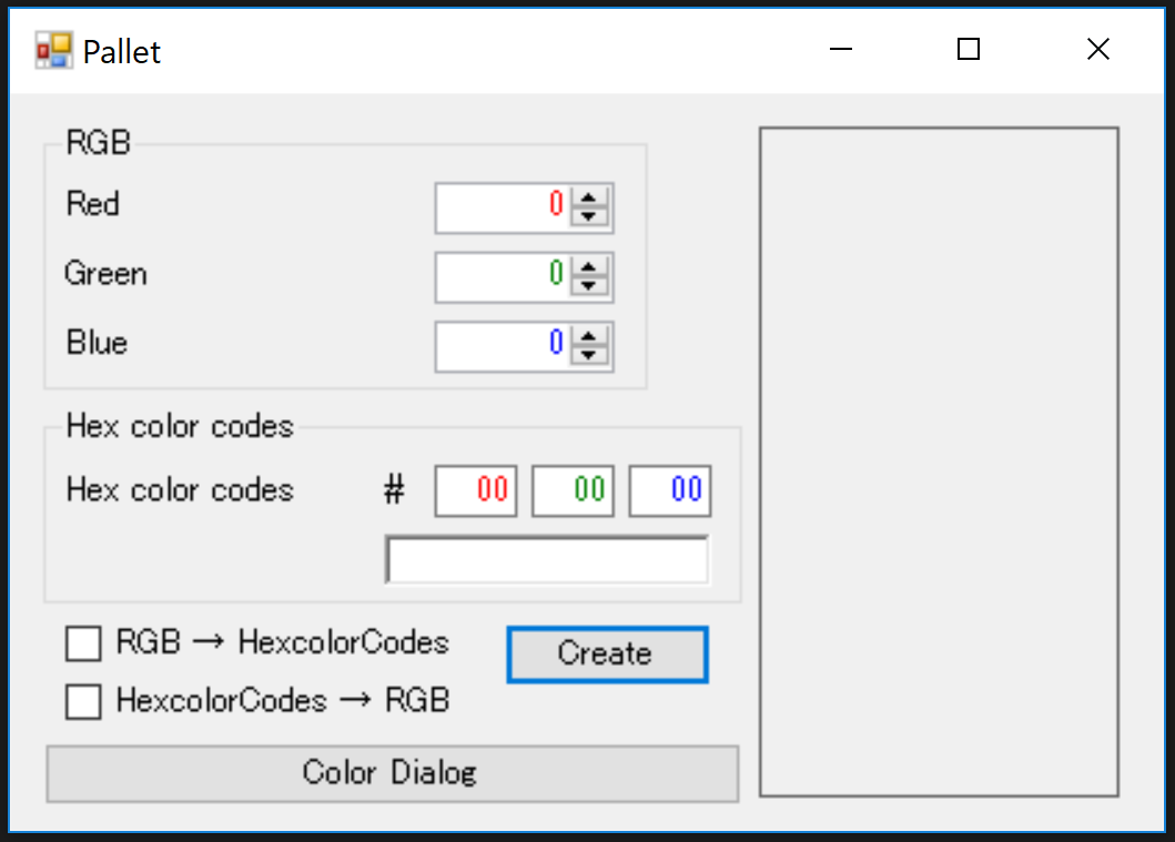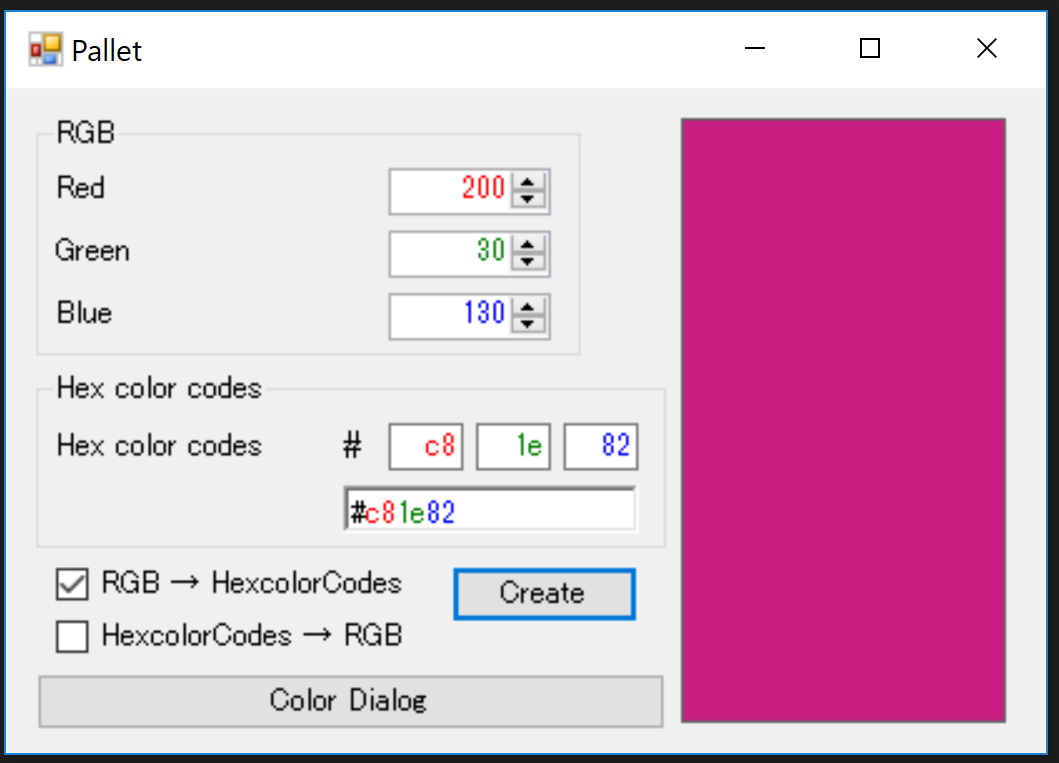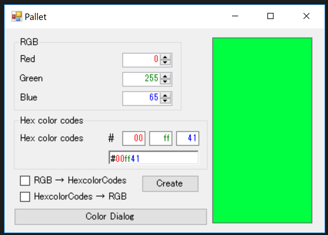 Form1.csusing System; using System.Drawing; using System.Windows.Forms; namespace WindowsFormsApp6 { public partial class Pallet : Form { public Pallet() { InitializeComponent(); } /// <summary> /// RGBまたは16進数カラーコードから値を取得し、色をパネルに表示 /// </summary> /// <param name="sender">イベント発行元</param> /// <param name="e">イベント情報</param> private void createButton_Click(object sender, EventArgs e) { // 「RGB → HexcolorCodes」にチェック時 if (RGBCheckBox.Checked == true && hexcolorCodesCheckBox.Checked == false) { // RGB の値を取得 int R = (int)redNumericUpDown.Value; int G = (int)greenNumericUpDown.Value; int B = (int)blueNumericUpDown.Value; //設定した色をパネルに表示 DrawingPanel(R, G, B); // 16進数カラーコードで表示 CreateHexadecimal(R, G, B); } // 「HexcolorCodes → RGB」にチェック時 else if (RGBCheckBox.Checked == false && hexcolorCodesCheckBox.Checked == true) { // 16進数カラーコードを取得し、16進数を10進数に変換 var R = Int32.Parse(redTextBox.Text, System.Globalization.NumberStyles.HexNumber); var G = Int32.Parse(greenTextBox.Text, System.Globalization.NumberStyles.HexNumber); var B = Int32.Parse(blueTextBox.Text, System.Globalization.NumberStyles.HexNumber); // 設定した色をパネルに表示 DrawingPanel(R, G, B); // RGB で表示 CreateRGB(R, G, B); } else { // チェックボックスの選択に不備があることをメッセージボックスで警告 MessageBox.Show(@"Please check either ""RGB → HexcolorCodes"" or ""HexcolorCodes → RGB"""); } } /// <summary> /// カラーダイアログから色を取得し、色をパネルに表示。または、RGB、16進数カラーコードに値を表示 /// </summary> /// <param name="sender">イベント発行元</param> /// <param name="e">イベント情報</param> private void dialogButton_Click(object sender, EventArgs e) { // カラーダイアログを表示 DialogResult dialogResult = colorDialog.ShowDialog(); // カラーダイアログからRGB の値を取得 int R = colorDialog.Color.R; int G = colorDialog.Color.G; int B = colorDialog.Color.B; // 設定した色をパネルに表示 DrawingPanel(R, G, B); // 16進数カラーコードで表示 CreateHexadecimal(R, G, B); // RGB で表示 CreateRGB(R, G, B); } /// <summary> /// 設定したRGB の色をパネルに表示 /// </summary> /// <param name="R">赤色の値</param> /// <param name="G">緑色の値</param> /// <param name="B">青色の値</param> private void DrawingPanel(int R, int G, int B) { // パネルに設定された色を表示 colorPanel.BackColor = Color.FromArgb(R, G, B); // RGBを16進数に変換し、16進数カラーコードを「hexcolorCodesRichTextBox」に表示 hexcolorCodesRichTextBox.Text = "#" + $"{R:x2}" + $"{G:x2}" + $"{B:x2}"; // 「hexcolorCodesRichTextBox」に表示されたの文字を色分け hexcolorCodesRichTextBox.Select(1, 0); hexcolorCodesRichTextBox.SelectionLength = 2; hexcolorCodesRichTextBox.SelectionColor = Color.Red; hexcolorCodesRichTextBox.Select(3, 0); hexcolorCodesRichTextBox.SelectionLength = 2; hexcolorCodesRichTextBox.SelectionColor = Color.Green; hexcolorCodesRichTextBox.Select(5, 0); hexcolorCodesRichTextBox.SelectionLength = 2; hexcolorCodesRichTextBox.SelectionColor = Color.Blue; } /// <summary> /// RGB を表示 /// </summary> /// <param name="R">赤色の値</param> /// <param name="G">緑色の値</param> /// <param name="B">青色の値</param> private void CreateRGB(int R, int G, int B) { // 設定されたRGBをRGBグループの各RGBに表示 redNumericUpDown.Value = R; greenNumericUpDown.Value = G; blueNumericUpDown.Value = B; } /// <summary> /// 16進数カラーコードを表示 /// </summary> /// <param name="R">赤色の値</param> /// <param name="G">緑色の値</param> /// <param name="B">青色の値</param> private void CreateHexadecimal(int R, int G, int B) { // 設定されたRGBをHex color codesグループの各RGBに表示 redTextBox.Text = $"{R:x2}"; greenTextBox.Text = $"{G:x2}"; blueTextBox.Text = $"{B:x2}"; } } }もっと簡略的にできそうだけど、浮かばない (((;^ω^)))