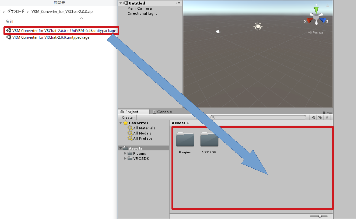 - 2つのunitypackageが入っているので、ファイル名に UniVRM という文字が含まれる方を Assets にドラッグ&ドロップし、「Import」します。