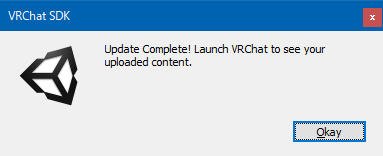 - 正常にアップロードが完了すると、「Upload Comlete! Launch VRChat to see your uploaded content.」というダイアログが表示されます。