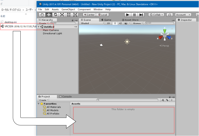 - ダウンロードしておいたSDKを、下の Assets という領域にドラッグ&ドロップします。