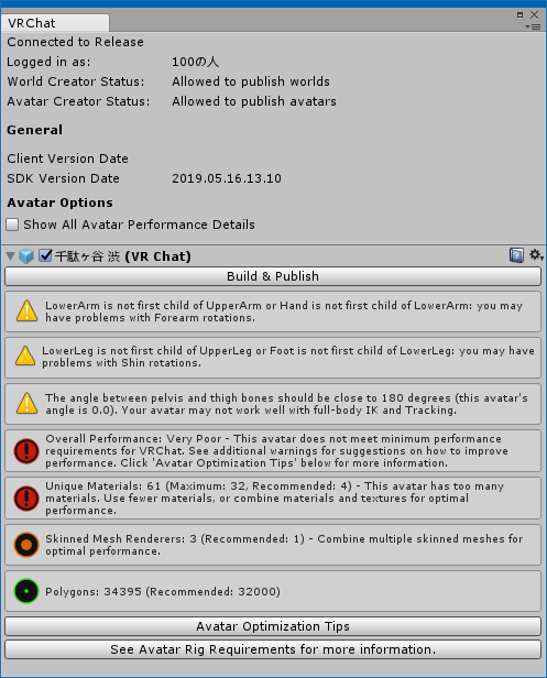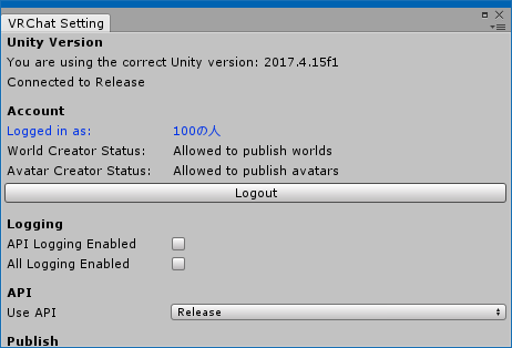 - 「Avatar Creator Status: Allowed to publish avatars」と表示されているのを確認し、「VRChat Settings」ウィンドウを閉じます。