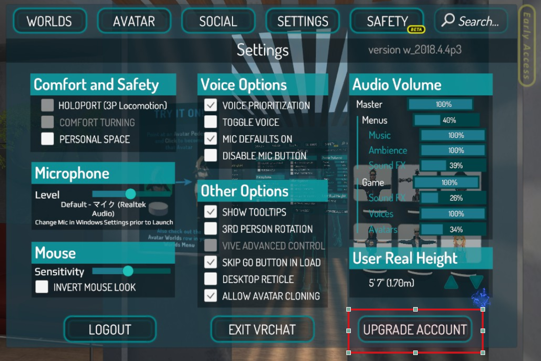 - Settgins画面の右下にある UPGRADE ACCOUNT ボタンを押します。