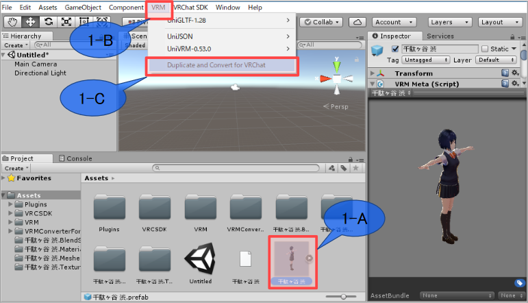 - Assetsのプレハブを選択した状態で、上の VRM メニューから、 Duplicate and Convert for VRChat を選択します。