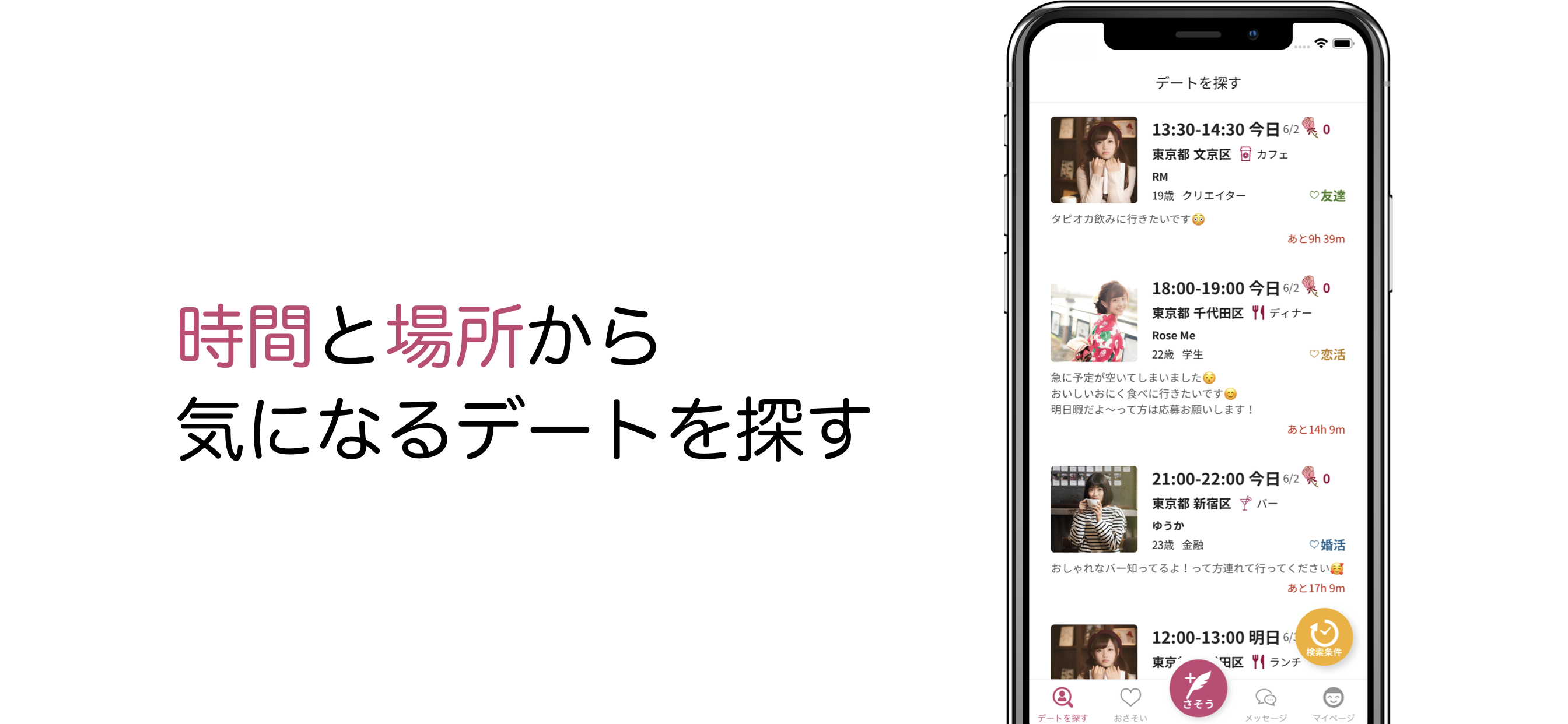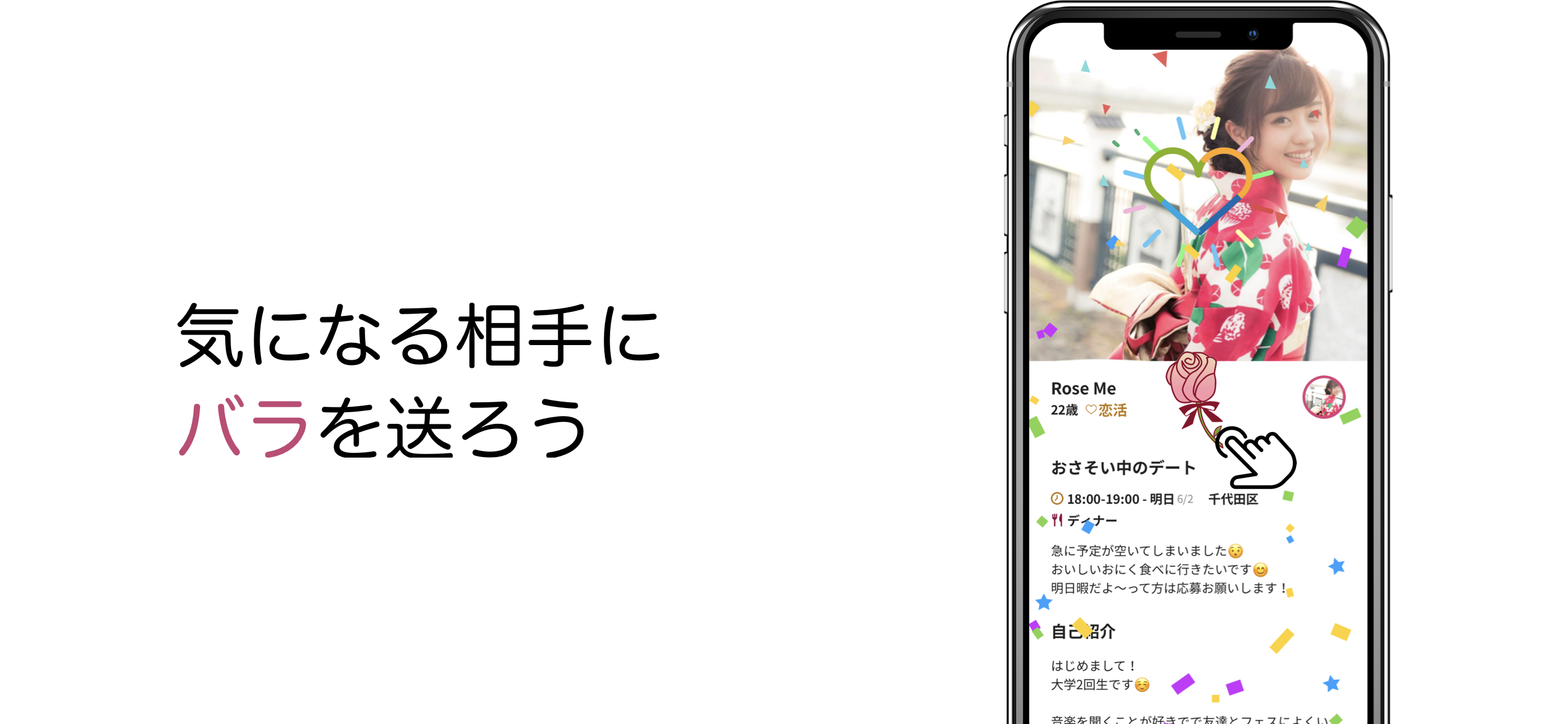 空いている時間に、好きな場所で1時間だけのデートのおさそいをして、ローズを送ることでデートに行きたいという気持ちを伝えることができます。