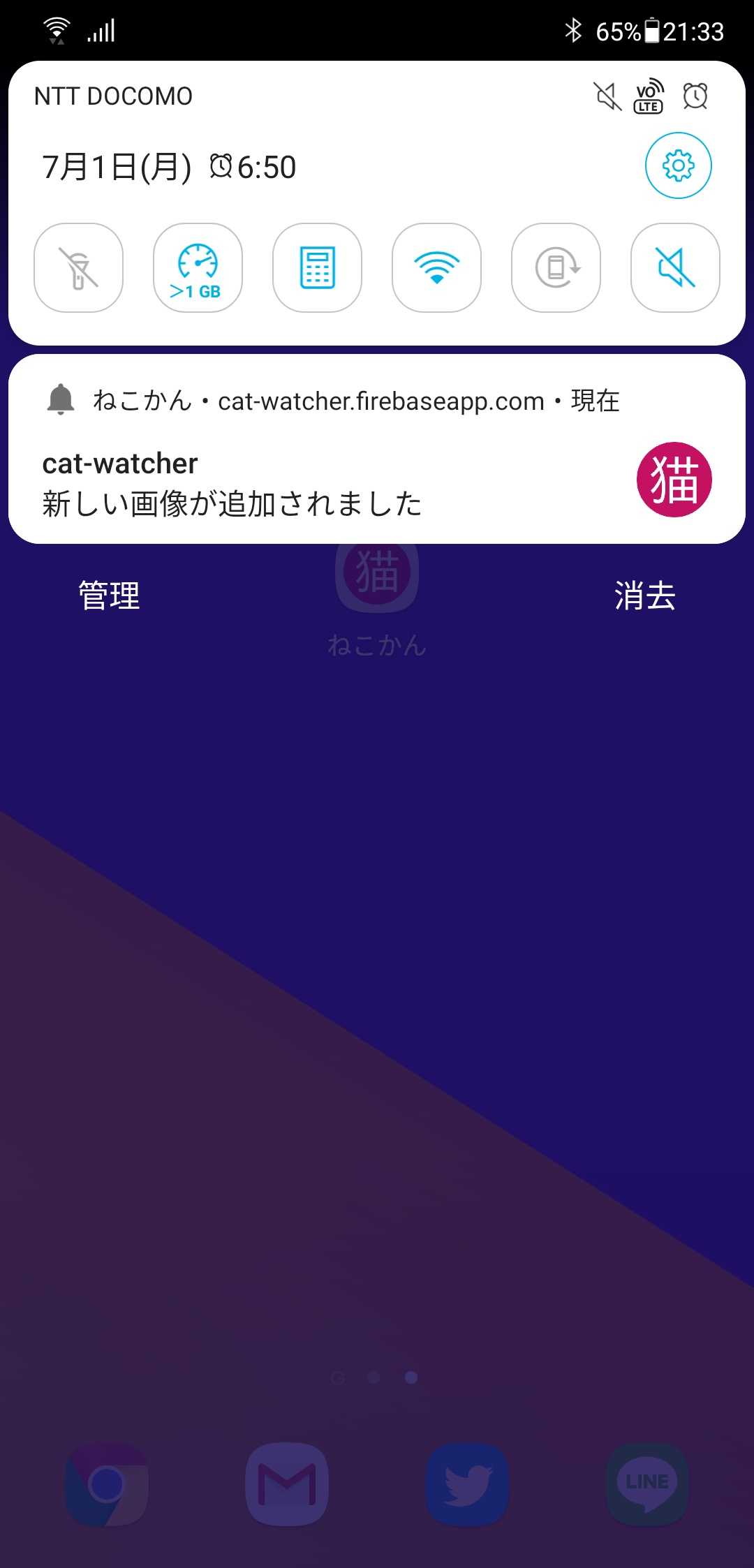 この処理により、トピックを購読している=通知を許可したユーザーの端末へPush通知が送信されます。functions/index.jsexports.sendMessage = functions.firestore .document('/images/{imageId}') .onCreate(async (snap, context) => { const message = { notification: { title: NOTIFICATION_TITLE, body: '新しい画像が追加されました', icon: 'https://cat-watcher.firebaseapp.com/android-chrome-512x512.png', click_action: 'https://cat-watcher.firebaseapp.com/' } } await admin.messaging().sendToTopic('/topics/cat', message) return null })クライアントでの表示