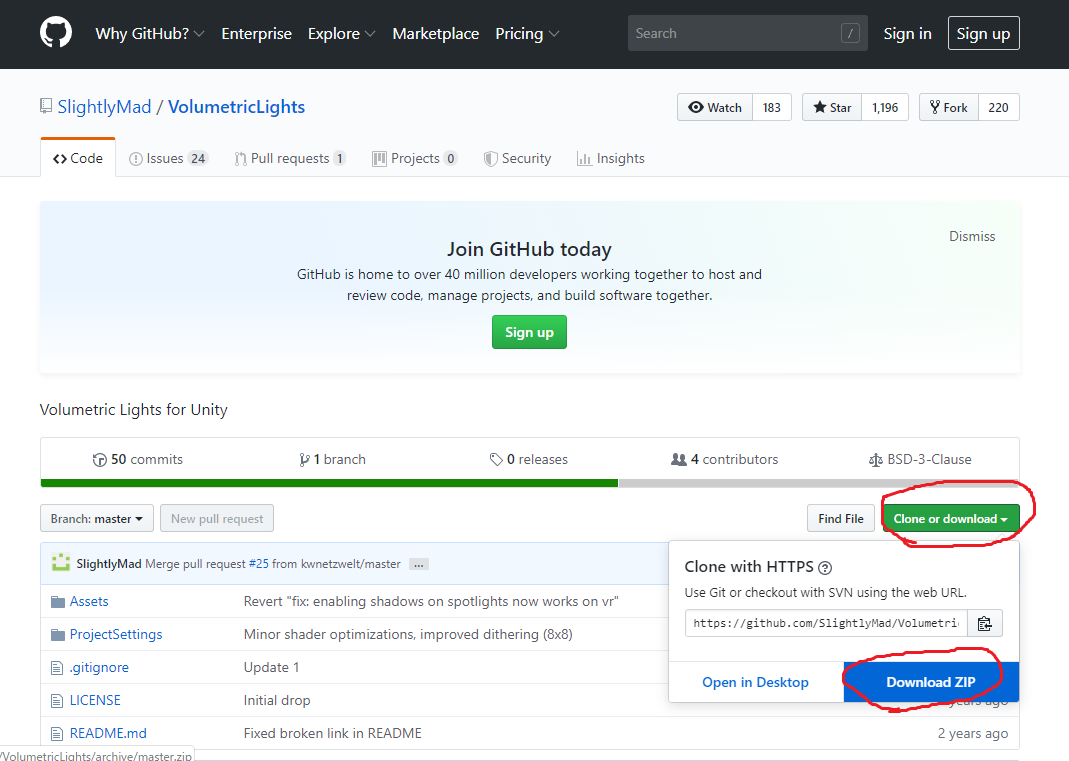 GitHubのプロジェクトページ にアクセスし、Download ZIPをクリック。