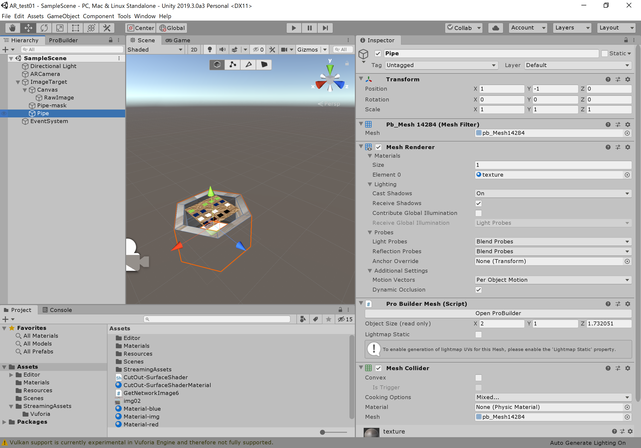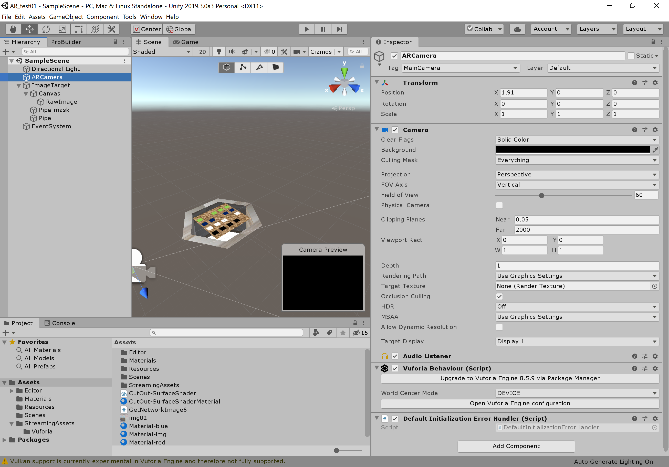 - ARを設定したカメラを通して板を見るとを、ARマーカーの位置をもとに3Dオブジェクトが表示されます。これがウソ穴です。