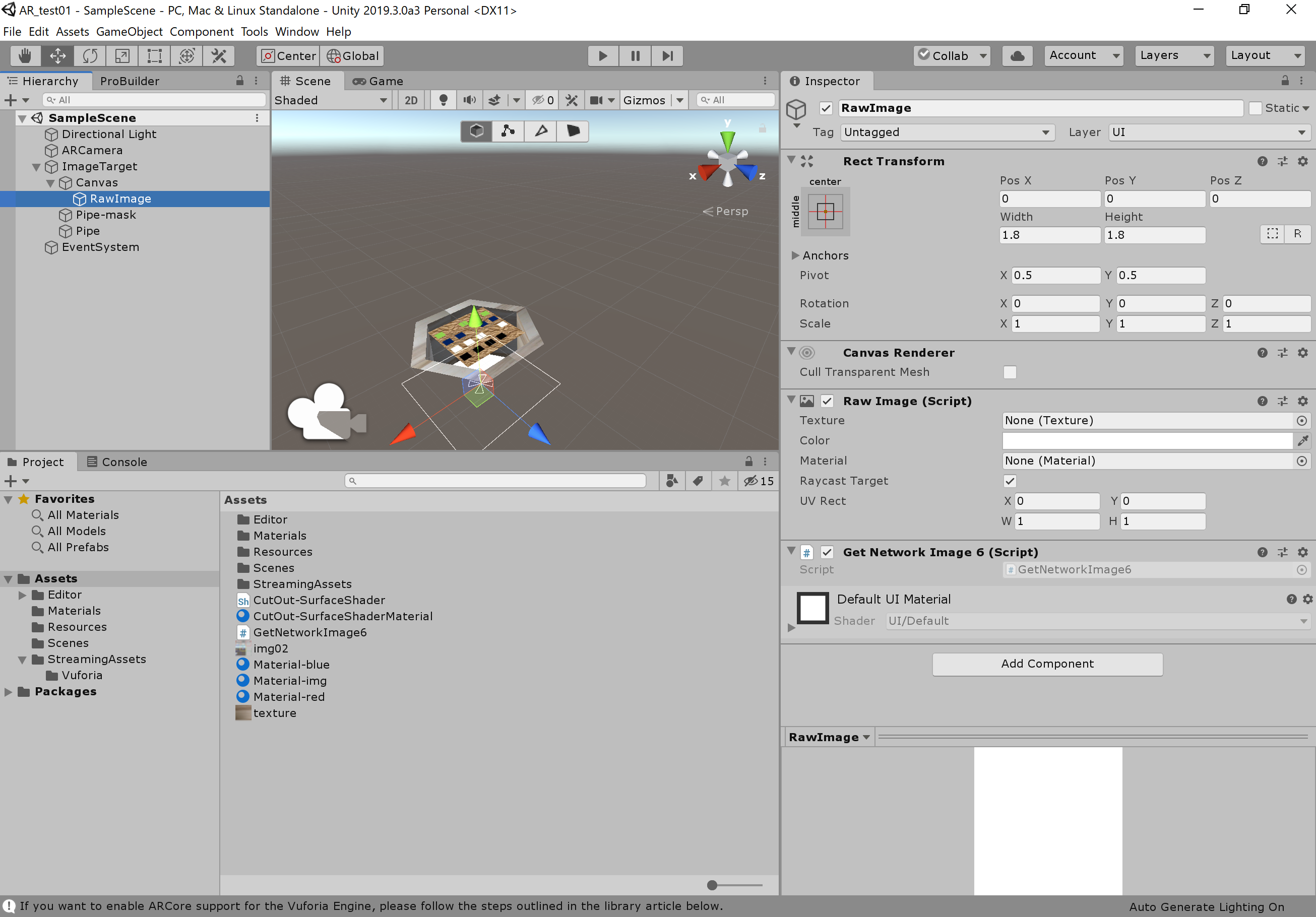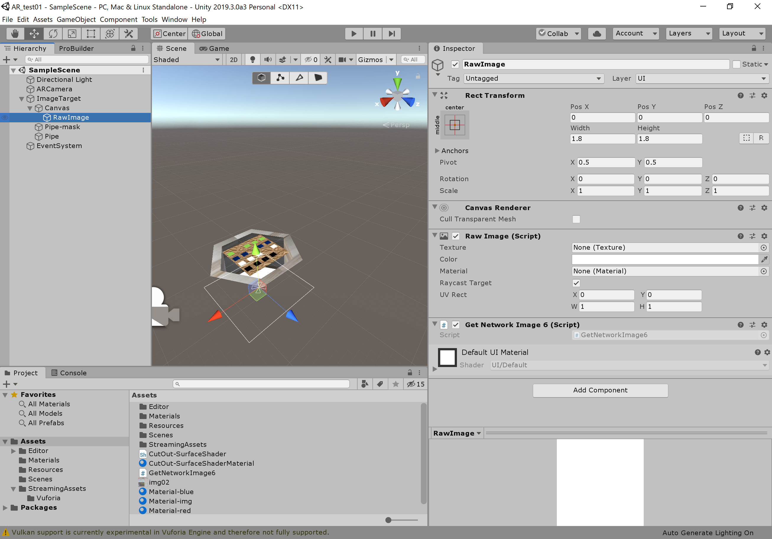 GetNetworkImage6.csを作成します。GetNetworkImage6.csusing UnityEngine; using System.Collections; using UnityEngine.UI; public class GetNetworkImage6 : MonoBehaviour { private float timeleft; IEnumerator RenewImage(){ string url = "http://{{ラズパイのIP}}:8090/?action=snapshot"; WWW www = new WWW(url); Debug.Log (www); yield return www; RawImage rawImage = GetComponent<RawImage>(); rawImage.texture = www.textureNonReadable; } void Start() { StartCoroutine( RenewImage() ); } void Update() { StartCoroutine( RenewImage() ); } }