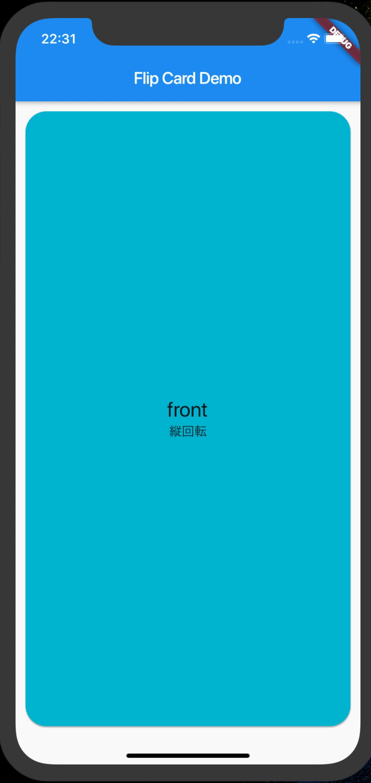 FlipCard( front: Card(...), // カード前面に表示するWidget back: Card(...), // カード背面に表示するWidget direction: FlipDirection.HORIZONTAL, // カード回転向き(HORIZONTAL:横<デフォルト>, VERTICAL:縦) flipOnTouch: true, // タッチ可否(true:カード部タップで回転する<デフォルト>, false:タップしても回転しない) speed: 500, // 回転スピード(500ミリ秒<デフォルト>) onFlip: () {}, // タップイベント onFlipDone: (isFront) {}, // タップイベント(前面かどうかbool値で判断できる) )サンプル
