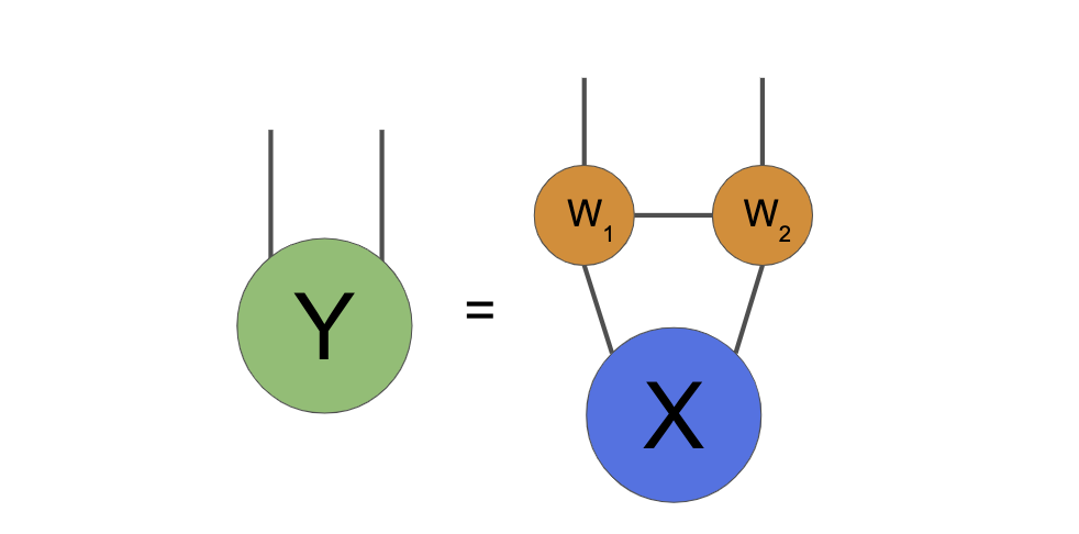 通常、レイヤーへの1024入力は、形状の単純な配列X(1024、)と考えます。 これらの入力に重み行列Wを掛けて、新しいベクトルYを生成します。次のステップはYに非線形性を適用することですが、TNの変更はレイヤーの線形部分にのみ影響するため、それには焦点を当てません。 テンソルネットワーク表記では、Yの計算を次のように記述します: