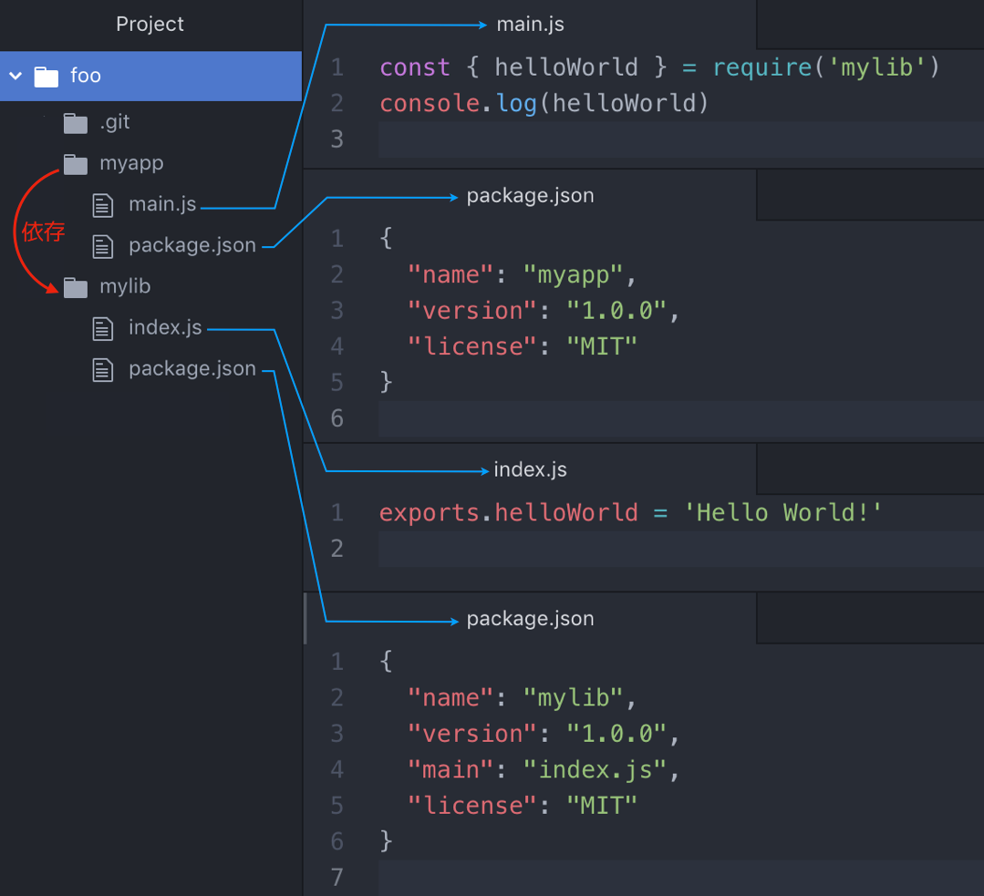 mylibのindex.jsでは、helloWorld変数が提供されていて、myappのmain.jsでそれを使いたいとします。このとき、