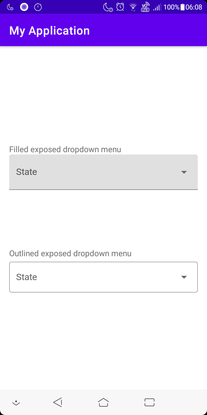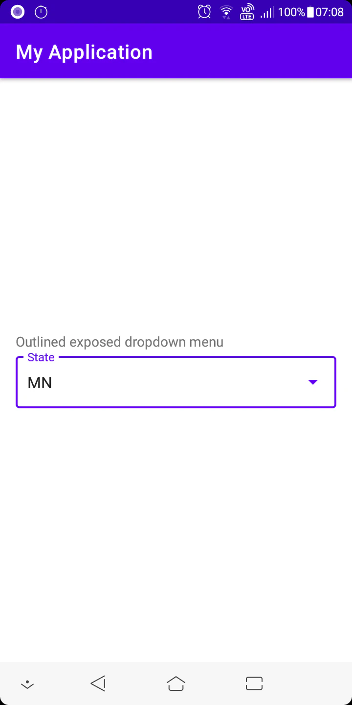 MainActivity.ktpackage com.objectfanatics.myapplication import android.os.Bundle import android.widget.ArrayAdapter import android.widget.AutoCompleteTextView import androidx.appcompat.app.AppCompatActivity class MainActivity : AppCompatActivity() { override fun onCreate(savedInstanceState: Bundle?) { super.onCreate(savedInstanceState) setContentView(R.layout.activity_main) // get AutoCompleteTextView val autoCompleteTextView = findViewById<AutoCompleteTextView>(R.id.outlined_exposed_dropdown) // create and set menu items val menuItems = listOf("MN", "NY", "NC", "ND") val adapter = ArrayAdapter(this, R.layout.dropdown_menu_popup_item, menuItems) autoCompleteTextView.setAdapter(adapter) // set default menu item autoCompleteTextView.setText("NY", false) } }おわりに