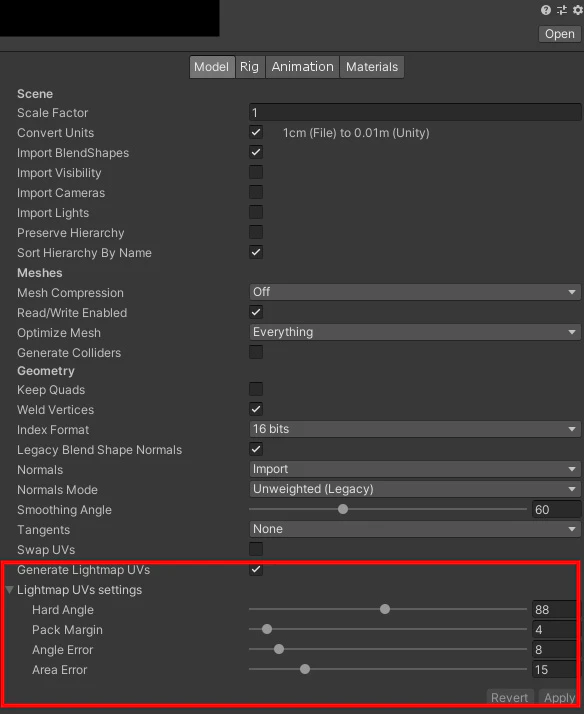 またReceive Shadowsをオンにしないと影がこの物体にBakeされません。オンにしましょう。fbx Import Settings
