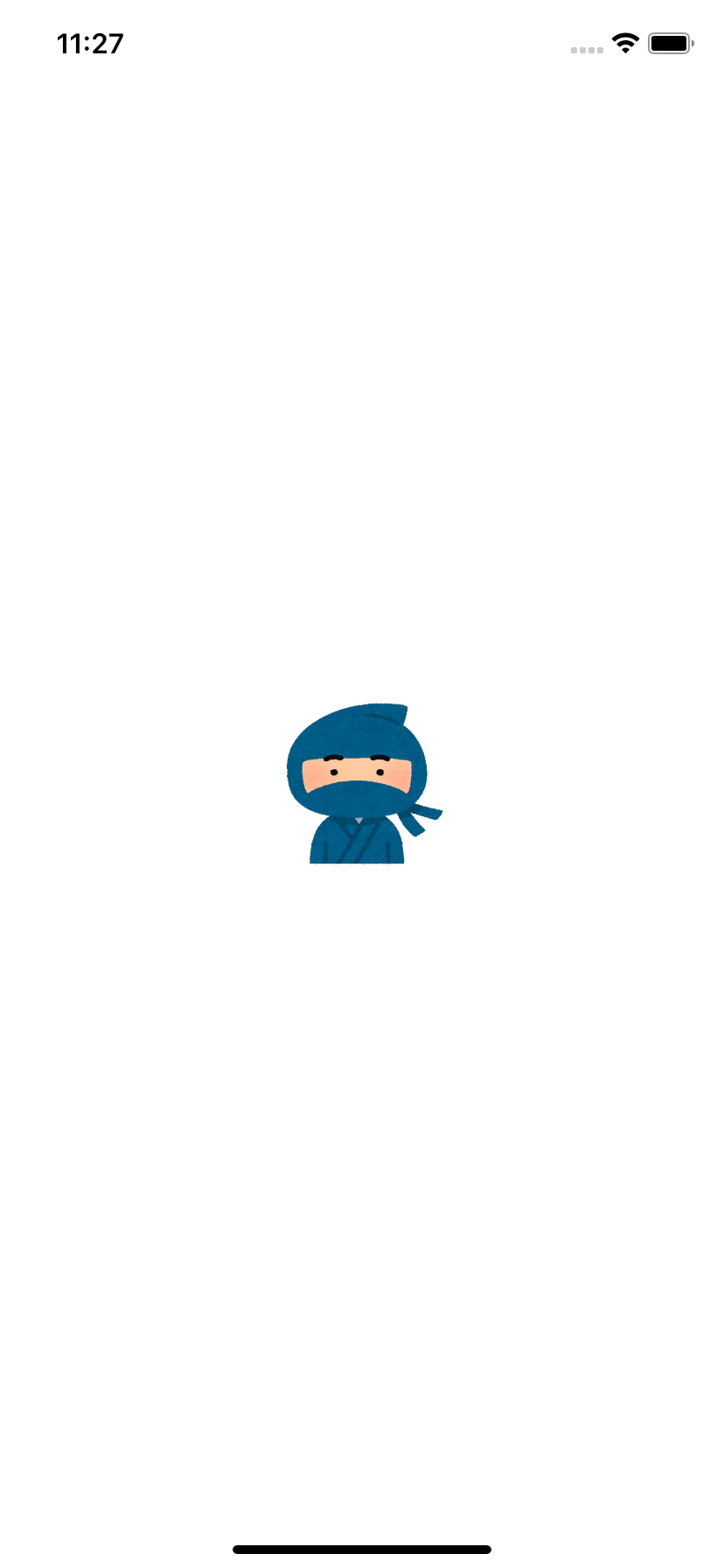 import UIKit class ViewController: UIViewController { override func viewDidLoad() { super.viewDidLoad() // UIImageの初期化 let image: UIImage = UIImage(named: "ninja")! // UIImageViewの初期化 let imageView = UIImageView(image: image) // 画面の縦幅・横幅を取得 let viewWidth: CGFloat = view.frame.size.width let viewHeight: CGFloat = view.frame.size.height // 画像に設定したい縦・横幅を変数に格納 let imageWidth: CGFloat = 100 let imageHeight: CGFloat = 100 // 画像の座標・大きさを生成 let rect: CGRect = CGRect(x: 0, y: 0, width: imageWidth, height: imageHeight) // 指定した座標・大きさを設定 imageView.frame = rect; // 画像を画面の中央を指定 imageView.center = CGPoint(x: viewWidth / 2, y: viewHeight / 2) // viewにUIImageViewを追加 self.view.addSubview(imageView) } }コードだけで画像が真ん中に配置されました。かわいいね。