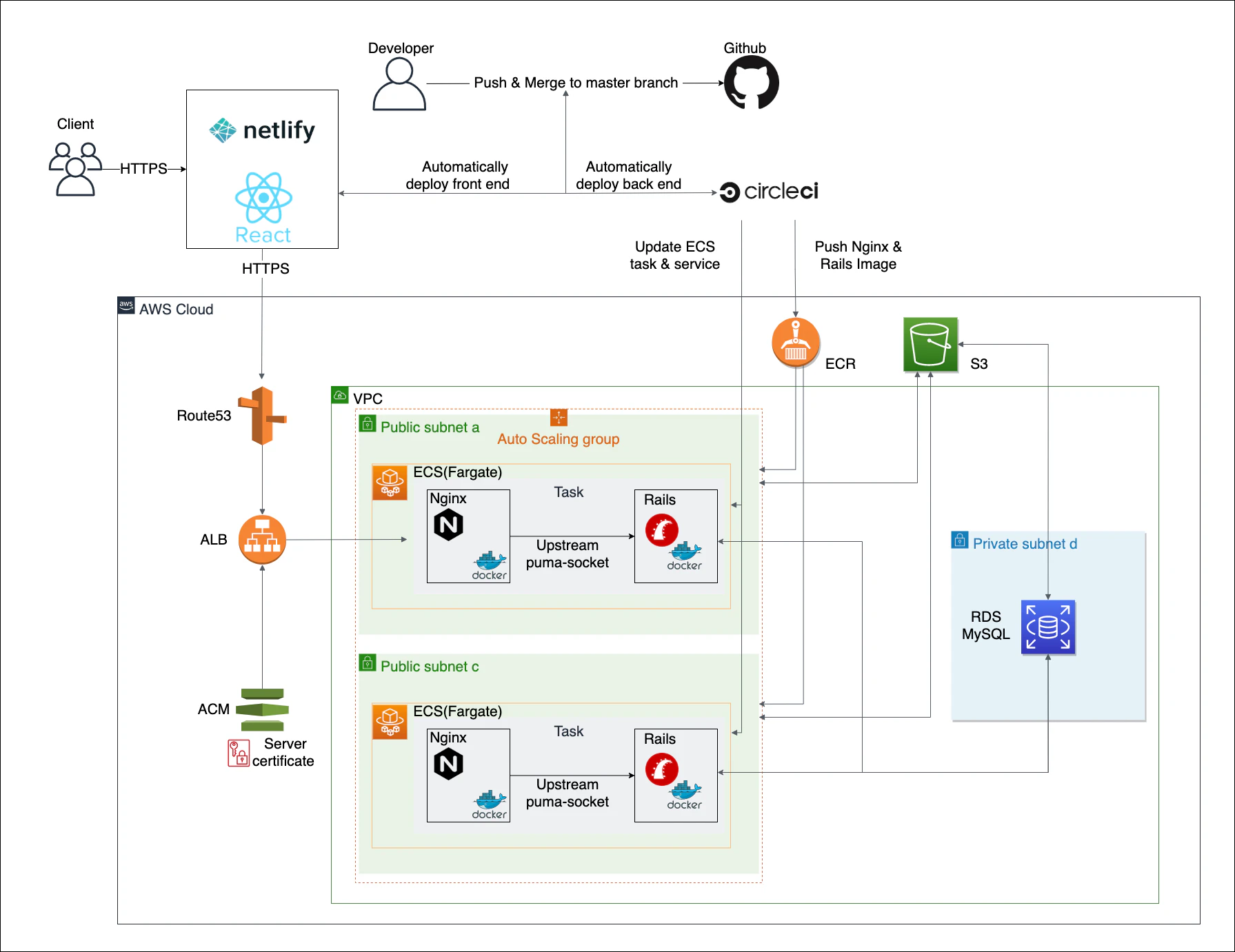 ECS (Fargate): コンテナ向けサーバーレスコンピューティングエンジン。この中に Rails と Nginx の Docker イメージを入れて稼働させるECR: Rails と Nginx の Docker イメージを保存しておくリポジトリRDS (MySQL): AWS が用意しているスケーラブルなデータベースエンジンALB: 負荷分散を担うロードバランシングサービスRoute53: サイトの独自ドメイン化に使用ACM: サイトの https 化に使用S3: 静的ホスティングサービス。書籍画像の保存・管理に使用