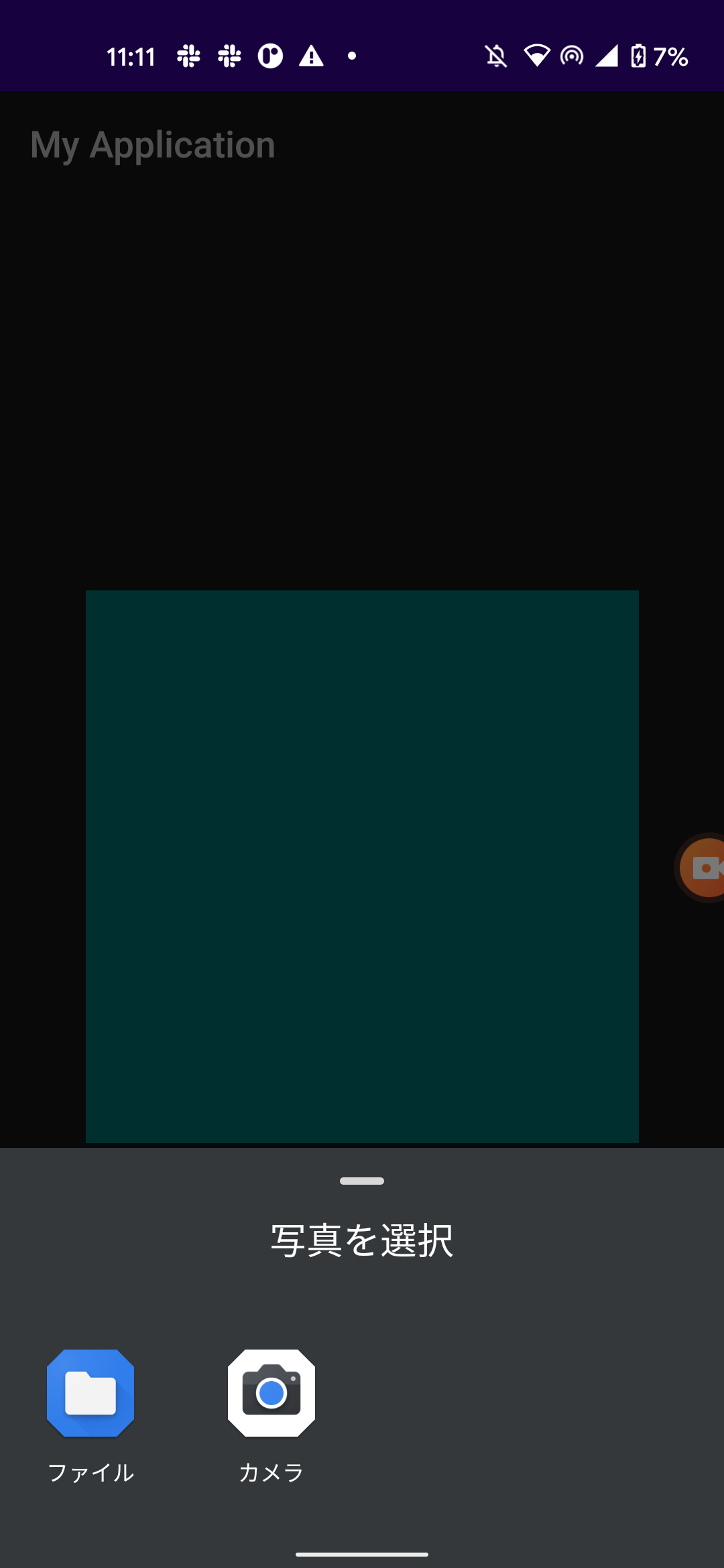 <manifest> <uses-feature android:name="android.hardware.camera" android:required="true" /> </manifest>activity_main.xml<?xml version="1.0" encoding="utf-8"?> <androidx.constraintlayout.widget.ConstraintLayout xmlns:android="http://schemas.android.com/apk/res/android" xmlns:app="http://schemas.android.com/apk/res-auto" xmlns:tools="http://schemas.android.com/tools" android:layout_width="match_parent" android:layout_height="match_parent" tools:context=".MainActivity"> <ImageView android:id="@+id/upload_image" android:layout_width="300dp" android:layout_height="300dp" android:background="@color/teal_700" app:layout_constraintBottom_toBottomOf="parent" app:layout_constraintLeft_toLeftOf="parent" app:layout_constraintRight_toRightOf="parent" app:layout_constraintTop_toTopOf="parent" /> </androidx.constraintlayout.widget.ConstraintLayout>MainActivity.ktpackage com.example.myapplication import android.content.Intent import android.graphics.Bitmap import android.graphics.BitmapFactory import android.os.Bundle import android.provider.MediaStore import android.widget.ImageView import android.widget.Toast import androidx.appcompat.app.AppCompatActivity class MainActivity : AppCompatActivity() { override fun onCreate(savedInstanceState: Bundle?) { super.onCreate(savedInstanceState) setContentView(R.layout.activity_main) val uploadImage = findViewById<ImageView>(R.id.upload_image) uploadImage.setOnClickListener { selectPhoto() } } companion object { private const val READ_REQUEST_CODE: Int = 42 } override fun onActivityResult(requestCode: Int, resultCode: Int, data: Intent?) { super.onActivityResult(requestCode, resultCode, data) val uploadImage = findViewById<ImageView>(R.id.upload_image) if (resultCode != AppCompatActivity.RESULT_OK) { return } when (requestCode) { READ_REQUEST_CODE -> { try { data?.data?.also { uri -> val inputStream = contentResolver?.openInputStream(uri) val image = BitmapFactory.decodeStream(inputStream) uploadImage.setImageBitmap(image) } } catch (e: Exception) { Toast.makeText(this, "READ_REQUEST_CODEのエラーが発生しました", Toast.LENGTH_LONG).show() } } } } private fun selectPhoto() { val documentIntent = Intent(Intent.ACTION_OPEN_DOCUMENT).apply { addCategory(Intent.CATEGORY_OPENABLE) type = "image/*" } val cameraIntent = Intent(MediaStore.ACTION_IMAGE_CAPTURE).also { takePictureIntent -> } val target: List<Intent> = listOf(documentIntent,cameraIntent) val intent = Intent(Intent.ACTION_VIEW) if(intent.resolveActivity(getPackageManager()) != null) { val chooser = Intent.createChooser(documentIntent,"写真を選択").apply { putExtra(Intent.EXTRA_INITIAL_INTENTS , target.toTypedArray()) } startActivityForResult(chooser, READ_REQUEST_CODE) } } }